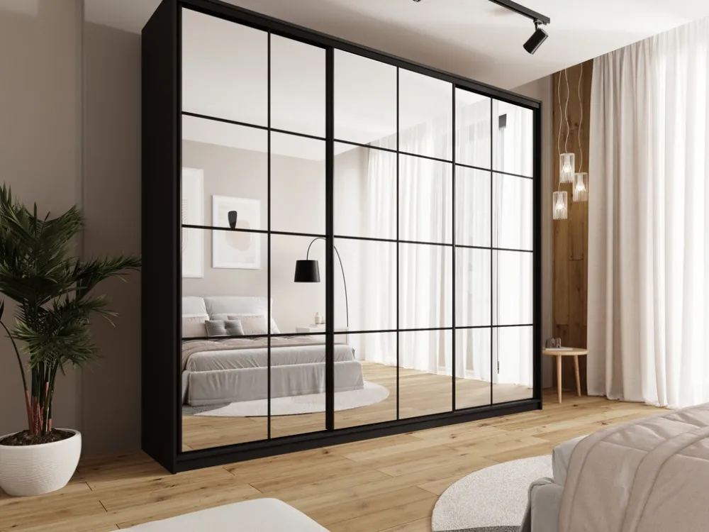 Szafa przesuwna o szerokości 280 cm OPTICA MAX to mebel, który łączy nowoczesny design z wyjątkową praktycznością. Stalowy system przesuwny w czarnym kolorze zapewnia płynne i ciche otwieranie drzwi, podkreślając elegancję i minimalistyczny charakter szafy. Jej trzy drzwi w całości pokryte lustrem nie tylko dodają wnętrzu klasy, ale także optycznie powiększają przestrzeń, wprowadzając do pomieszczenia więcej światła.