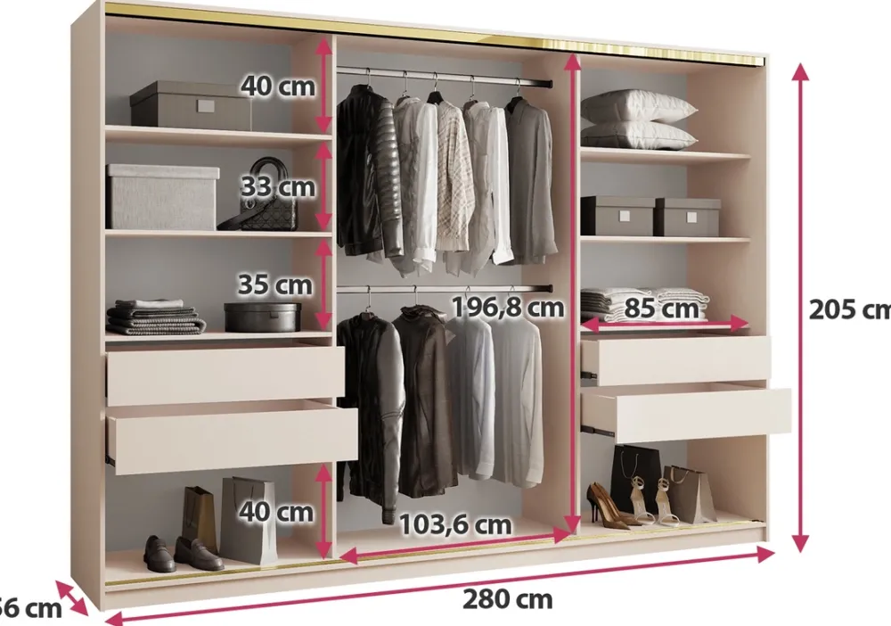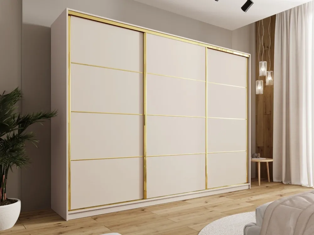 Wprowadź do swojego wnętrza elegancję i perfekcyjny porządek dzięki szafie przesuwnej o szerokości 280 cm. To mebel stworzony z myślą o praktycznym przechowywaniu, ale z wyraźnym akcentem estetycznym. Złoty stalowy system przesuwny oraz subtelne złote szprosy nadają szafie nowoczesnego, luksusowego charakteru, który doskonale wpisuje się w modne aranżacje wnętrz.