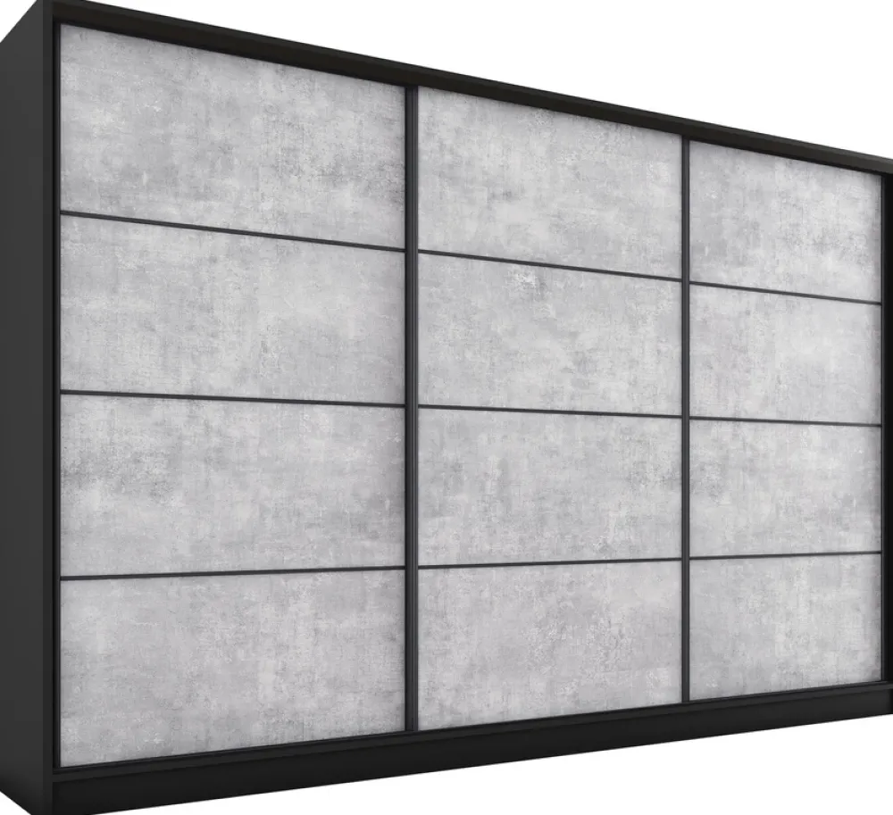 - Szafa przesuwna ma 280 cm szerokości i posiada dwa drążki na wieszaki, cztery szuflady i sześć półek. Szafa trzydrzwiowa w przepięknych kolorach. Szafa w kolorystyce betonu jasnego z korpusem w kolorze czarnym.