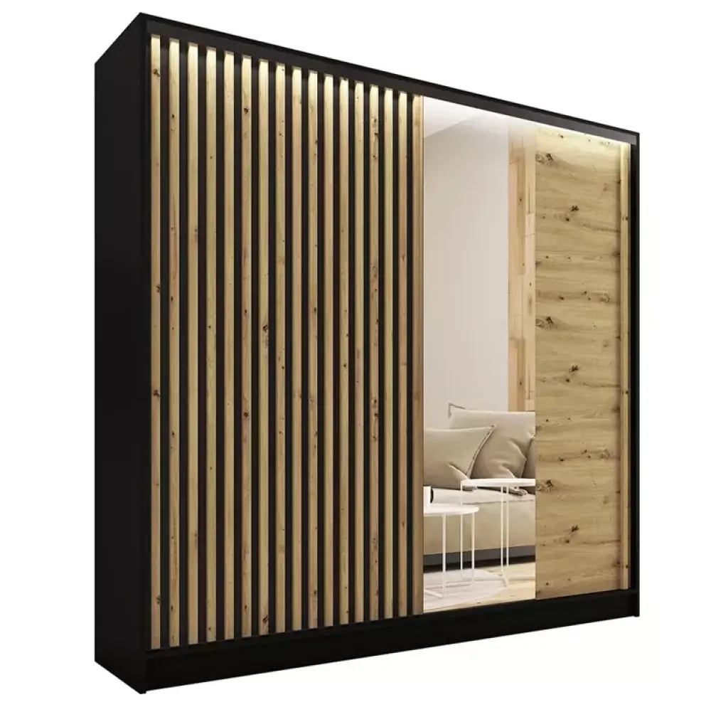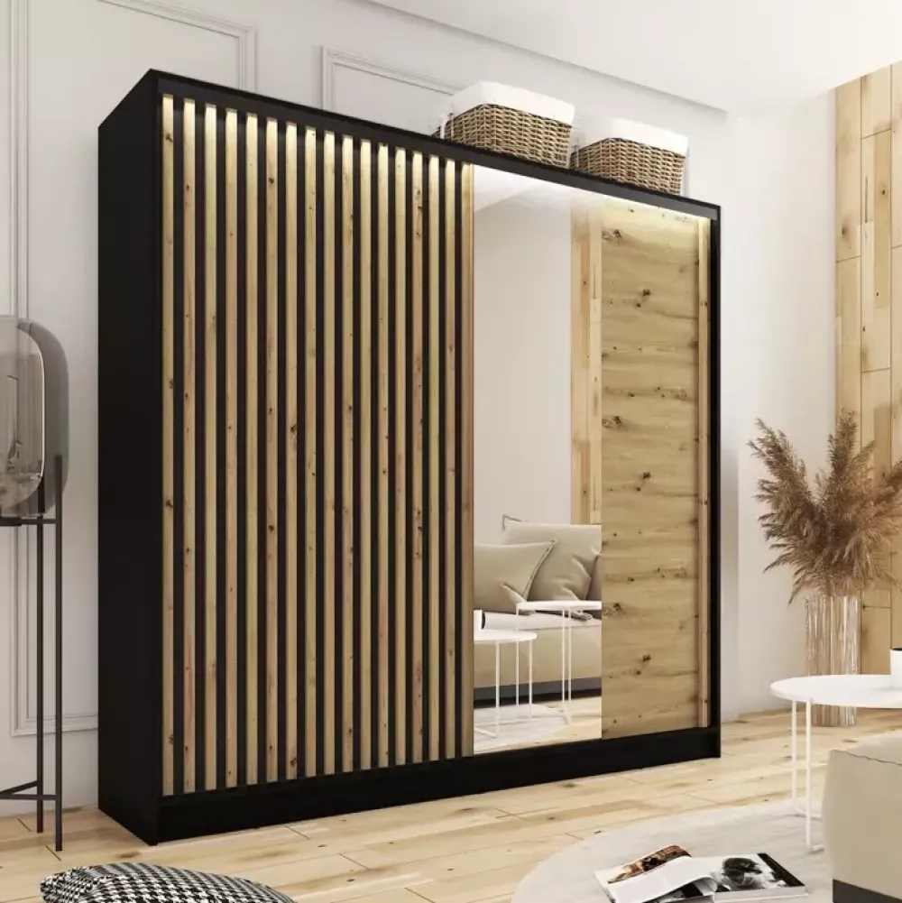 - Szafa przesuwna LAMEL 3D 200 cm z frontem premium z lameli MDF i lustrem. Wnętrze: 4 półki, 2 szuflady, 2 regulowane drążki. System bezuchwytowy, płyta laminowana, okleina ABS, opcja LED. Modny design i pełna funkcjonalność.