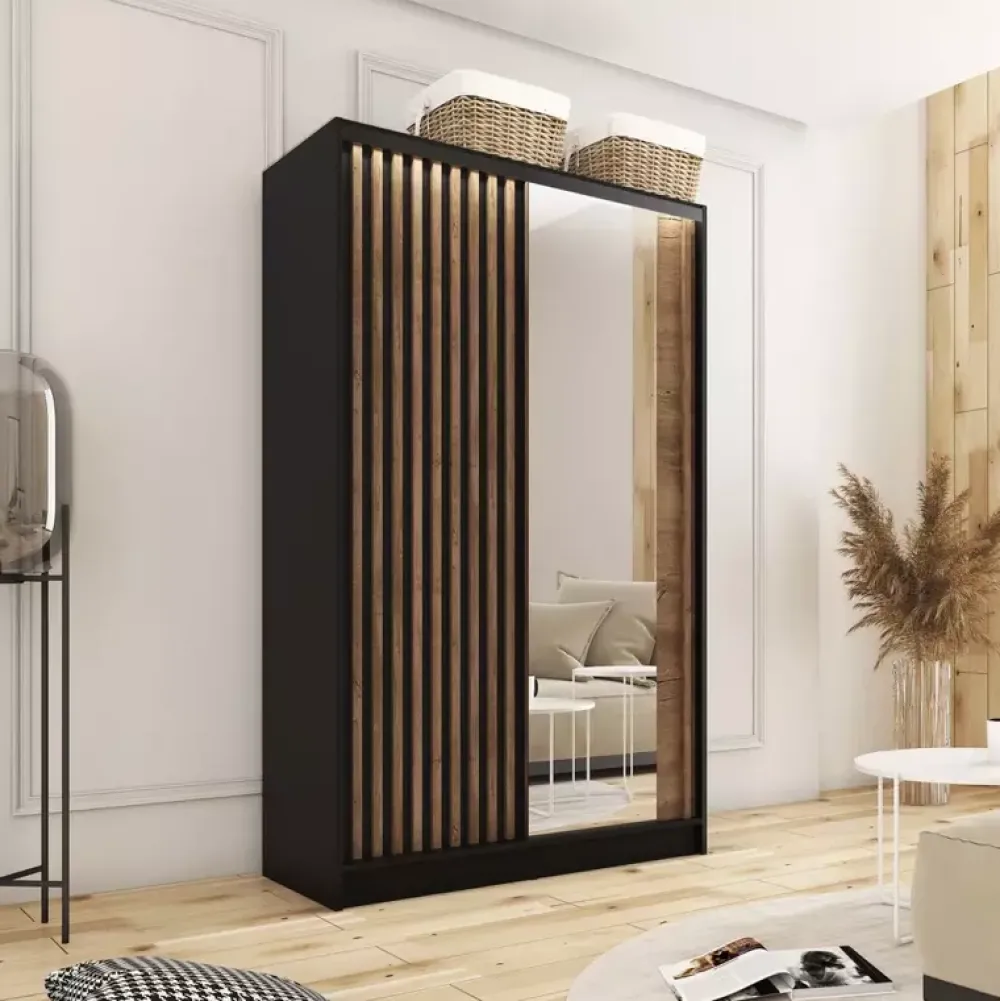 - Szafa niewyposażona w tradycyjne uchwyty, otwieranie odbywa się za pomocą listew przymocowanych do frontu.