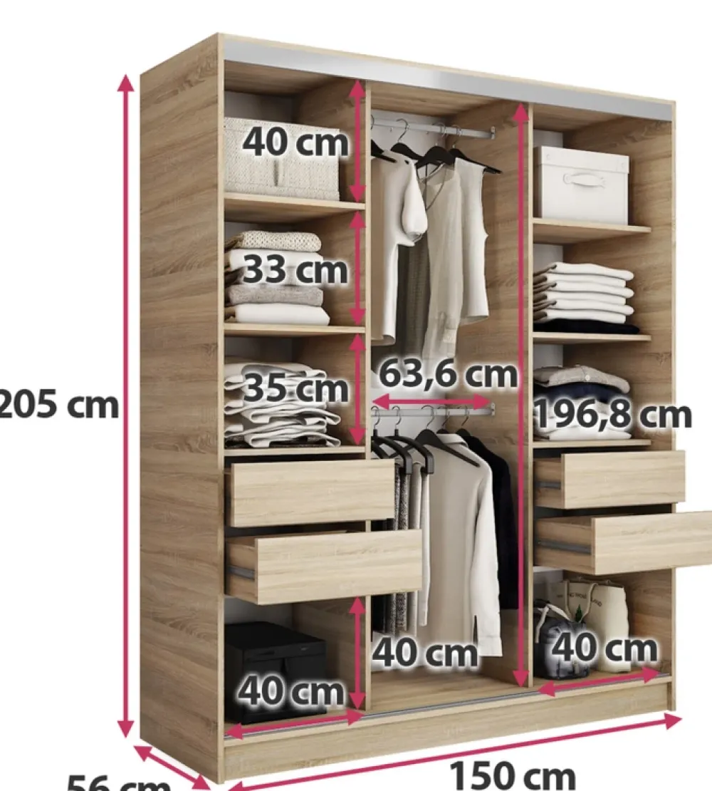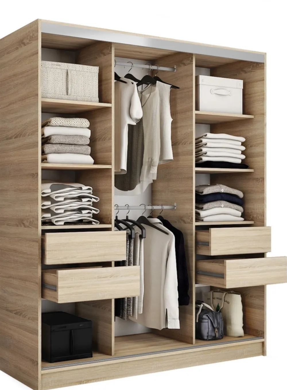 Trzy drzwi osadzone na stalowej prowadnicy pozwalają na łatwe i ciche otwieranie oraz zamykanie, zapewniając wygodę użytkowania. Szafa wyposażona jest w cztery praktyczne szuflady osadzone na prowadnicach kulkowych oraz cztery przestronne półki po obu stronach, oferując mnóstwo miejsca na różnorodne przedmioty. W centralnej części szafy znajdują się dwa aluminiowe drążki na wieszaki, które umożliwiają wygodne przechowywanie odzieży.