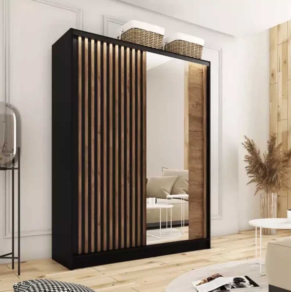 - Szafa przesuwna o szerokości 150 cm z wnętrzem zaaranżowanym z nastawieniem na jak największą swobodę użytkowania. Cztery duże półki, dwie szerokie szuflady oraz dwa drążki do samodzielnego nawiercenia, aby każdy mógł dopasować szafę do swoich potrzeb!