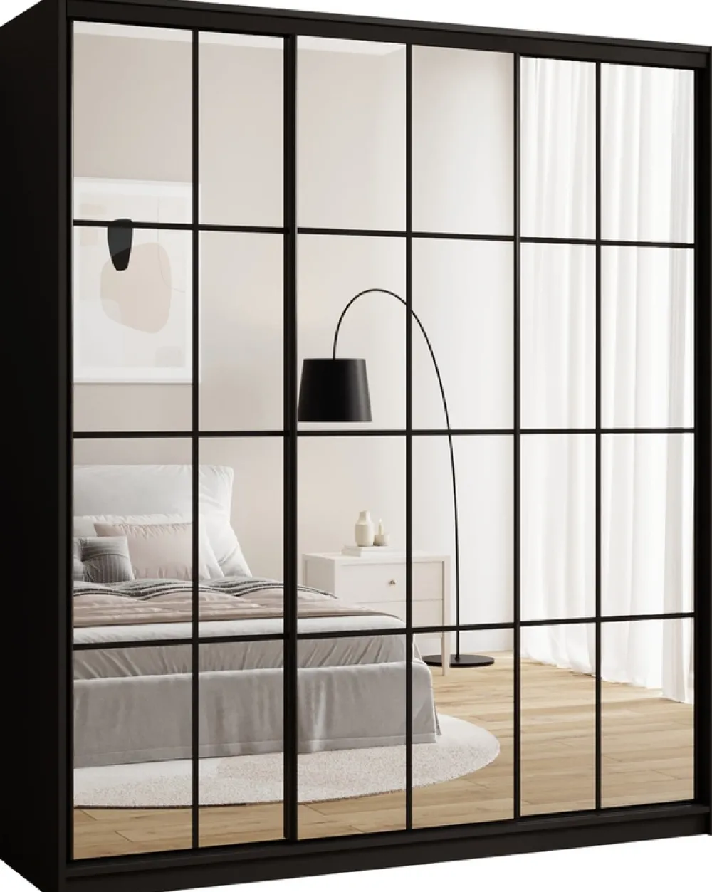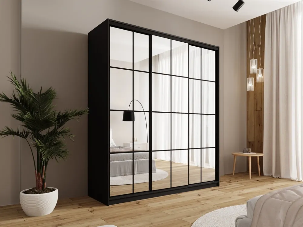 Szafa wyposażona jest w trzy przesuwne drzwi, które w całości wykonano z luster. Taka konstrukcja optycznie powiększa przestrzeń, dodając pomieszczeniu lekkości i nowoczesności. Czarne stalowe uchwyty oraz stalowy system przesuwny w czarnym kolorze nie tylko podkreślają elegancję mebla, ale także zapewniają trwałość i wygodę użytkowania.