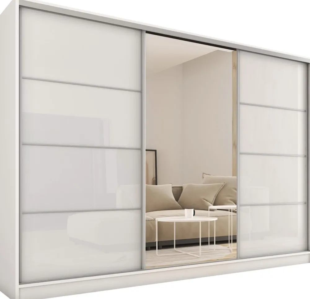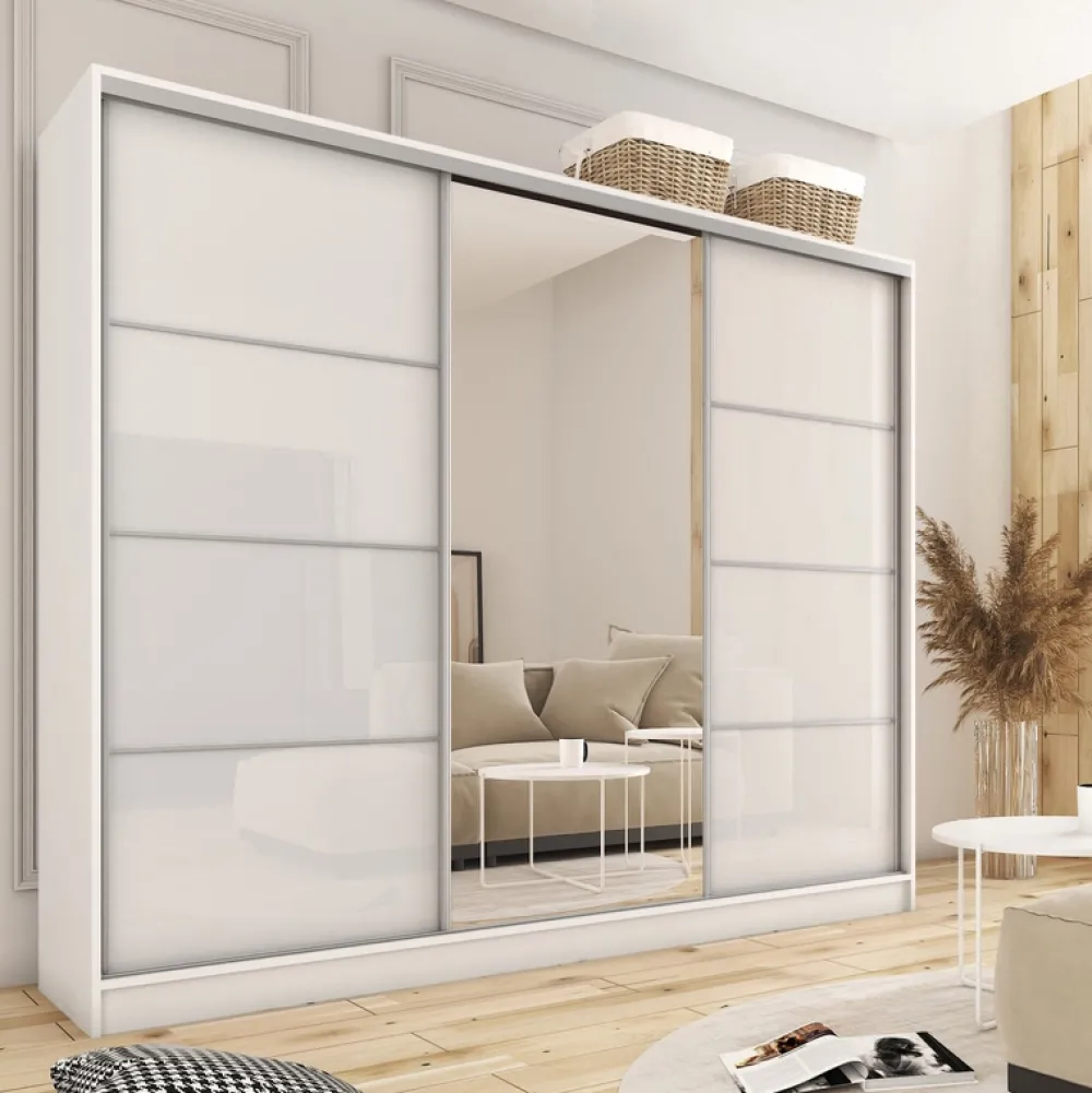 To, co wyróżnia tę nowoczesną szafę z lustrem, to trzy przesuwne drzwi umieszczone na solidnej stalowej prowadnicy, zapewniające płynne i ciche działanie. Centralne drzwi zdobi duże lustro, które optycznie powiększa przestrzeń i dodaje wnętrzu głębi.
