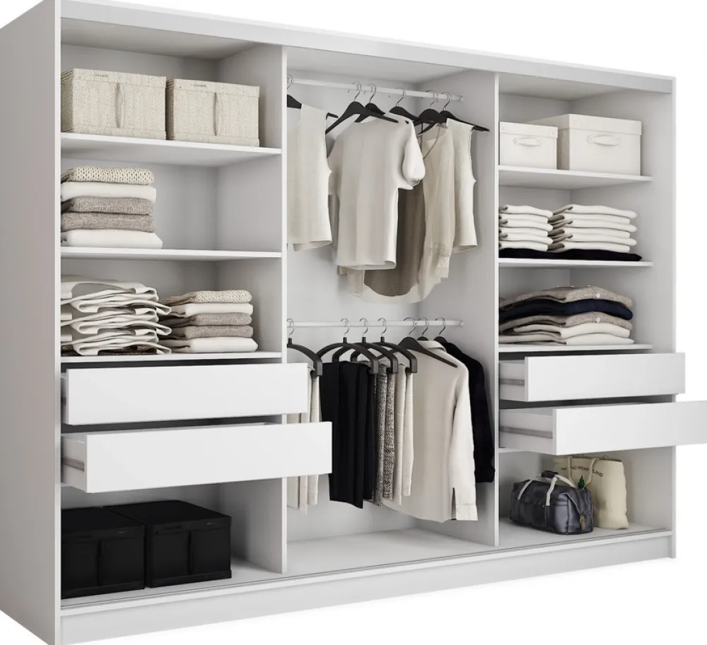 - Szafy przesuwne TOP 250 wyposażone są w cztery szuflady i sześć półek, które umieszczono po zewnętrznych stronach oraz dwa drążki na wieszaki w środkowej części mebla.