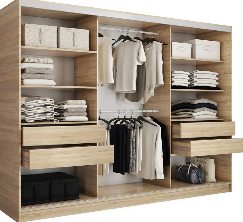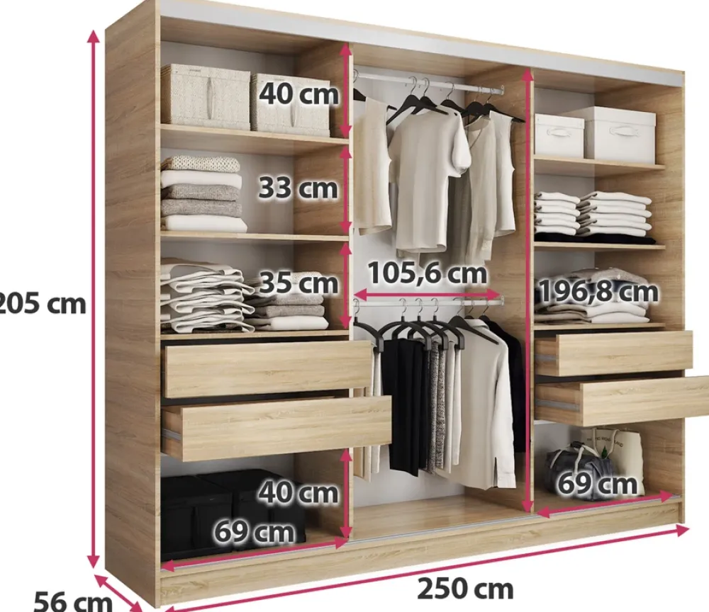 - Szafa wyposażona w półki, szuflady i drążki na wieszaki.