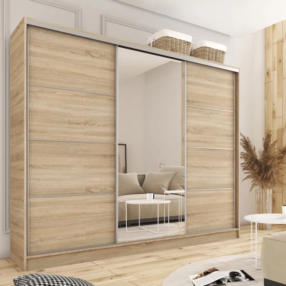Szafa wyposażona jest w trzy drzwi przesuwne, osadzone na solidnej stalowej prowadnicy, co gwarantuje płynne i ciche działanie. Centralne drzwi ozdobione są dużym lustrem, które nie tylko jest praktycznym dodatkiem, ale także optycznie powiększa przestrzeń.