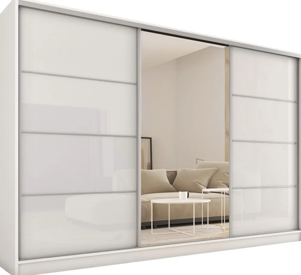 Trzy drzwi przesuwne osadzone na wytrzymałej stalowej prowadnicy zapewniają łatwy dostęp bez zajmowania dodatkowej przestrzeni. Centralne drzwi z pełnowymiarowym lustrem nie tylko dodają głębi pomieszczeniu, ale także ułatwiają codzienną rutynę.