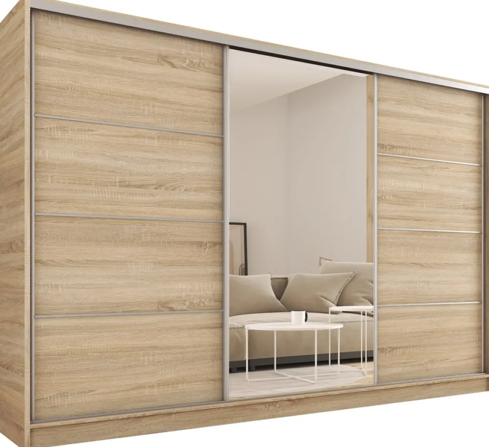 Szafa wyposażona jest w trzy drzwi przesuwne osadzone na solidnych stalowych prowadnicach, co zapewnia ich ciche i płynne działanie. Centralne drzwi mają wbudowane duże lustro, które optycznie powiększa przestrzeń i dodaje wnętrzu głębi.