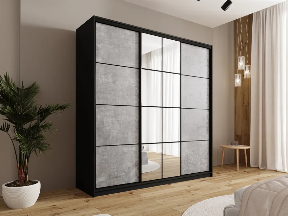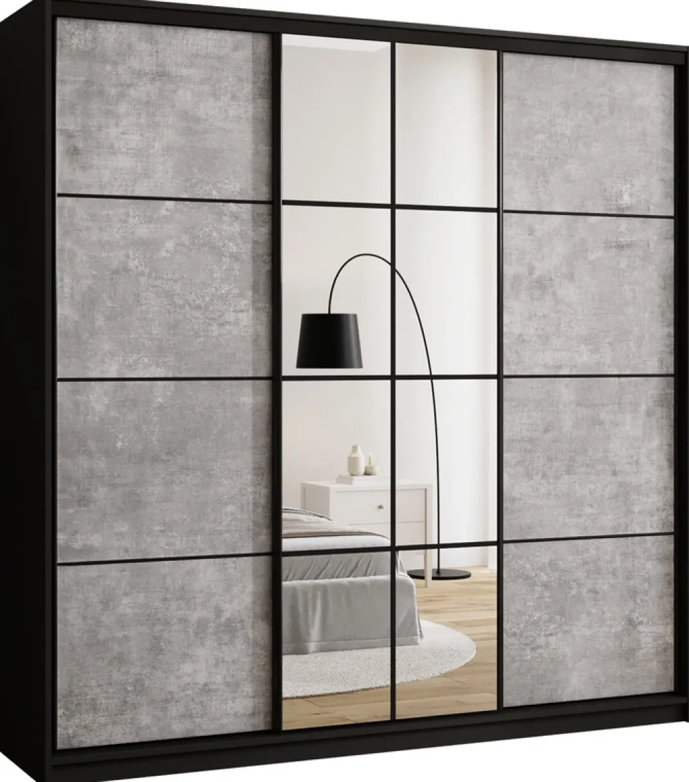 Nasza szafa z lustrem 200 cm wyróżnia się nowoczesnym wyglądem dzięki trzem drzwiom na stalowym systemie przesuwnym w eleganckim, czarnym kolorze. Czarne stalowe uchwyty dodają meblowi wyjątkowego charakteru, a jednocześnie zapewniają solidność i długowieczność użytkowania. System przesuwny umożliwia łatwe otwieranie i zamykanie drzwi bez potrzeby zajmowania dodatkowej przestrzeni.