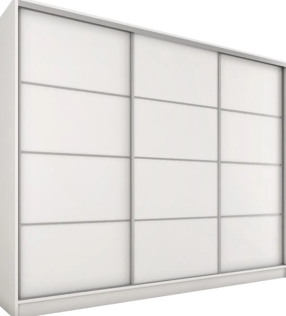 - Biała szafa przesuwna 250 cm TOP MAX posiada trzy drzwi osadzone na stalowym systemie przesuwnym. Za drzwiami zastosowaliśmy liczne półki, dwa metalowe drążki na wieszaki i cztery głębokie szuflady. Obrzeża zabezpieczono okleiną ABS.