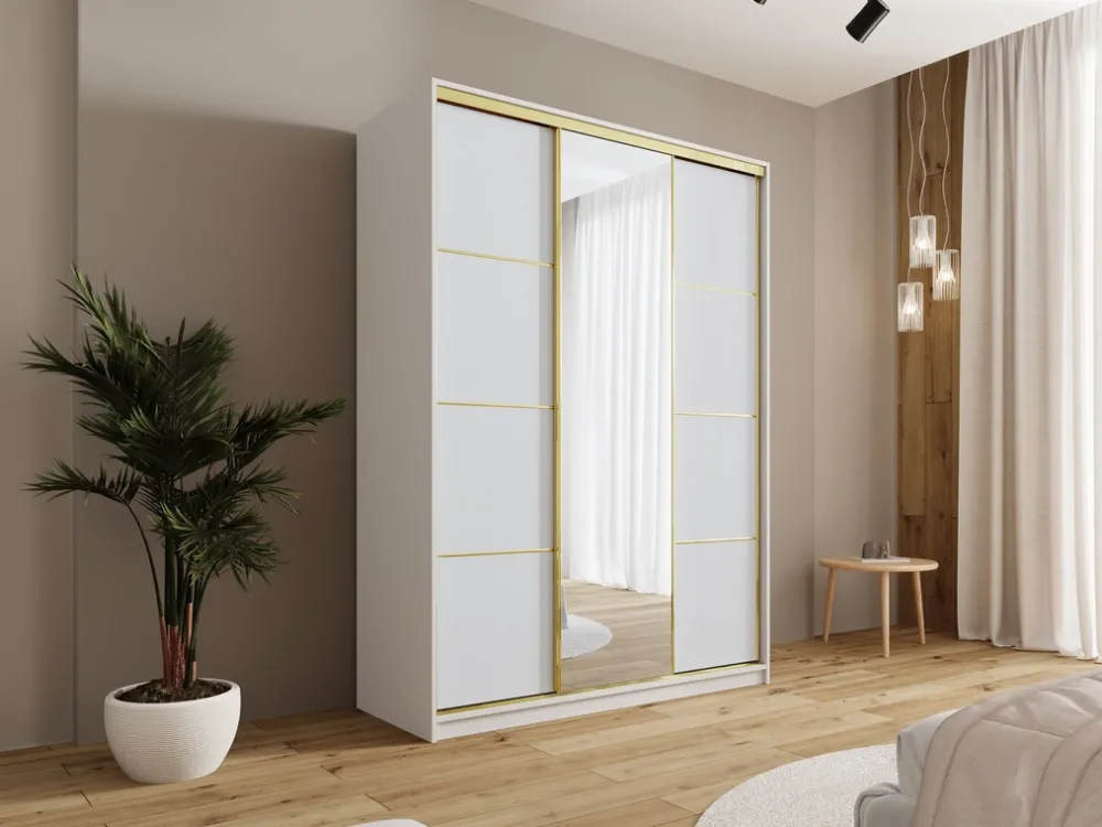 Dodaj swojej sypialni nuty luksusu i porządku dzięki eleganckiej szafie przesuwnej o szerokości 150 cm. Połączenie lustra, złotych detali i praktycznego układu wnętrza sprawia, że to idealne rozwiązanie do przechowywania ubrań, które jednocześnie staje się ozdobą wnętrza. Środkowe drzwi z lustrem optycznie powiększają przestrzeń, a złoty system przesuwny ze szprosami nadaje szafie nowoczesny, a zarazem szykowny charakter.