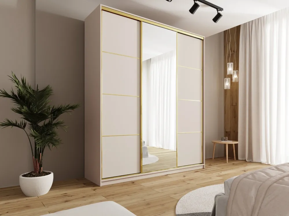 Wykończenie w kolorze złota to propozycja dla tych, którzy szukają nowoczesnego designu z nutą elegancji. Połączenie funkcjonalności i estetyki sprawia, że szafa idealnie wpisuje się zarówno w styl glamour, jak i minimalistyczne aranżacje.