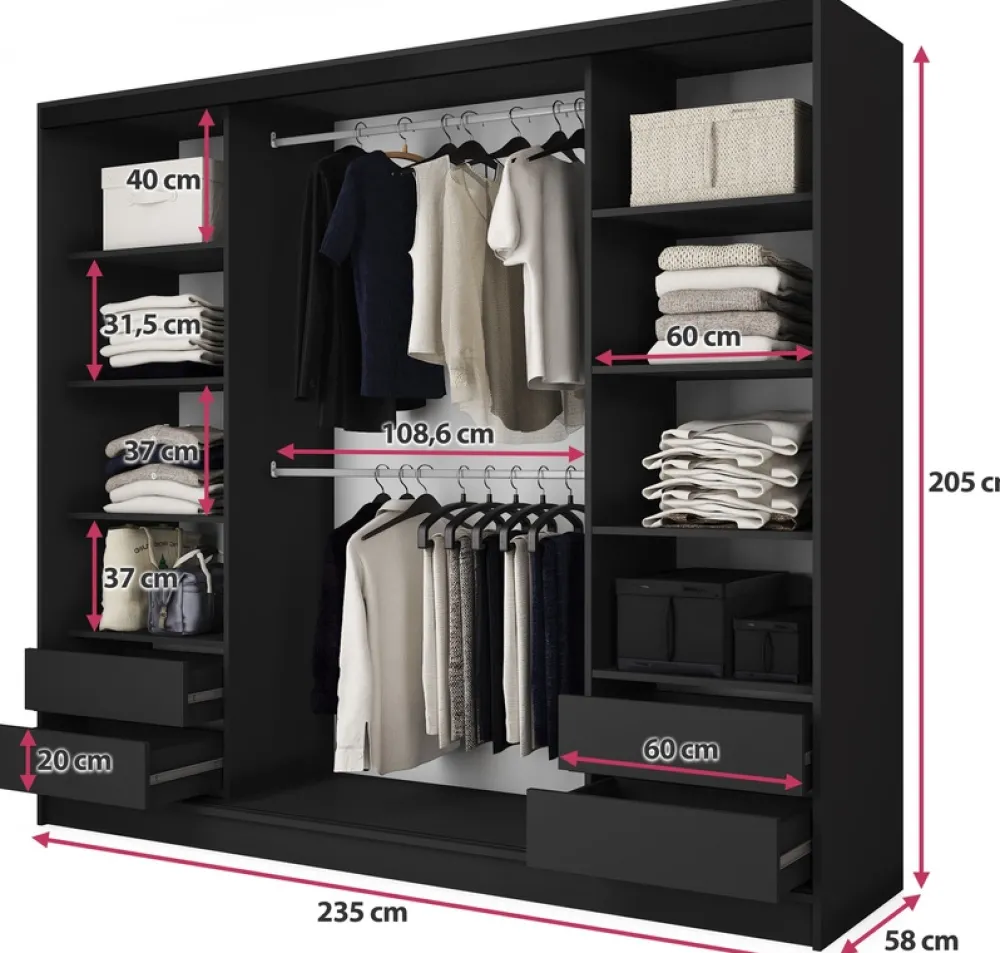 Podsumowując, ta szafa przesuwna to idealne połączenie funkcjonalności, wygody i nowoczesnego designu. Dzięki niej każda przestrzeń staje się bardziej elegancka, a przechowywanie ubrań i innych przedmiotów staje się łatwiejsze i bardziej przyjemne. Wybierając tę szafę, zyskujesz nie tylko piękny mebel, ale również praktyczne rozwiązanie do Twojego domu.