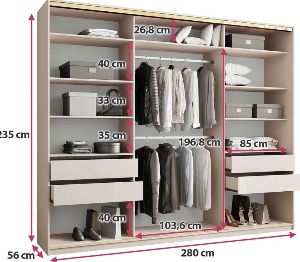 - Szafa przesuwna z lustrem 280 cm GOLD NEW MAX charakteryzuje się swoją wysokością 235 cm, dzięki czemu jest niezwykle pojemna. Szafa posiada trzy drzwi osadzone na stalowym systemie przesuwnym, liczne półki, cztery pojemne szuflady i dwa drążki.