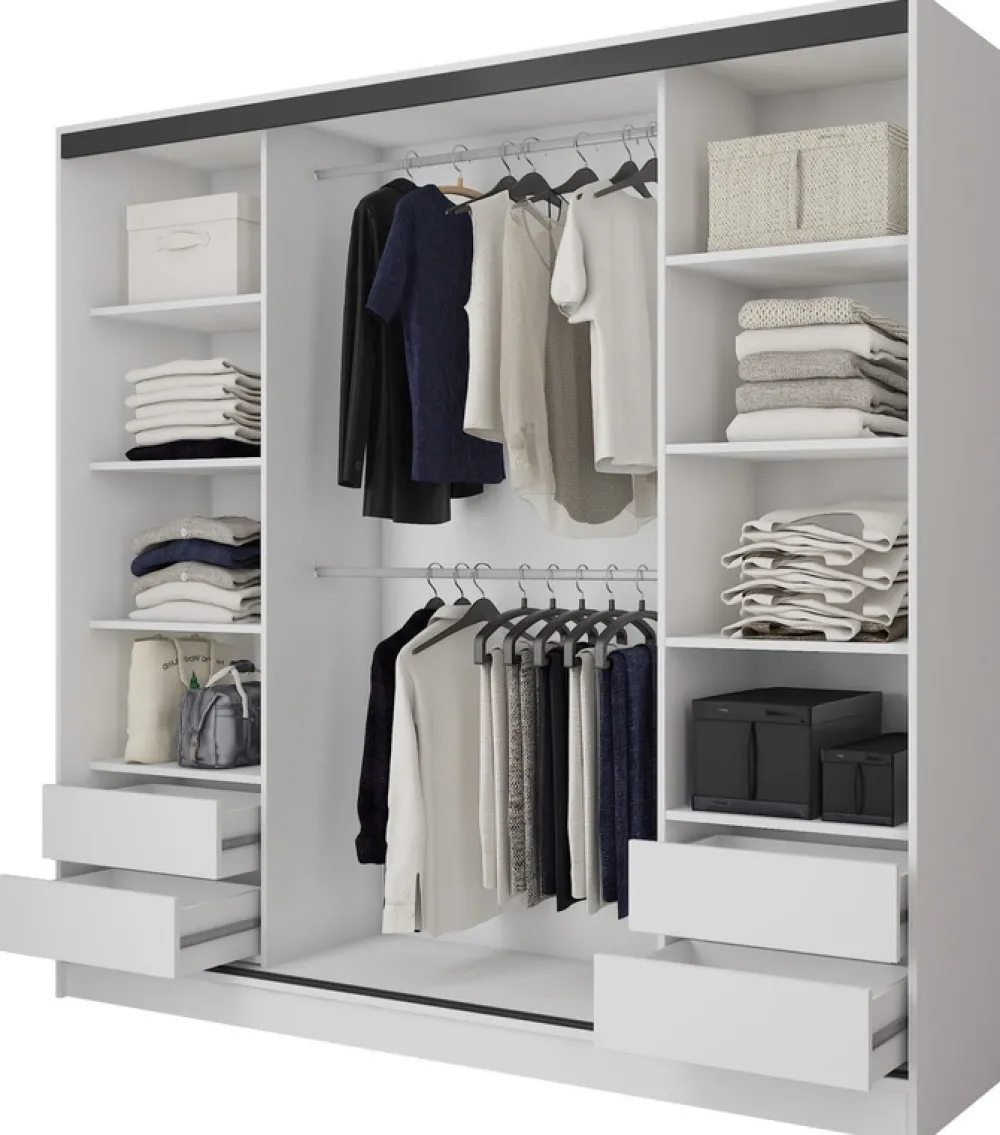 Wyposażona w osiem półek, ta szafa oferuje mnóstwo miejsca do przechowywania ubrań i innych przedmiotów. Cztery szuflady zapewniają dodatkową przestrzeń na drobniejsze akcesoria, gwarantując łatwy dostęp i porządek.
