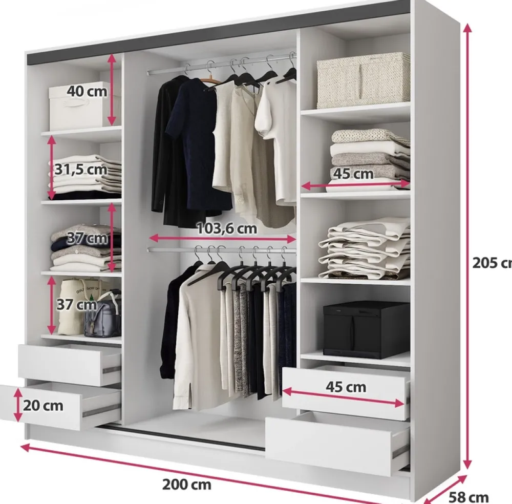 - Biała szafa przesuwna z lustrem BEST o szerokości 200 cm posiada osiem półek na ubrania, dwa aluminiowe drążki na wieszaki oraz cztery głębokie szuflady. Drzwi szafy poruszają się na solidnym aluminiowym systemie przesuwnym.