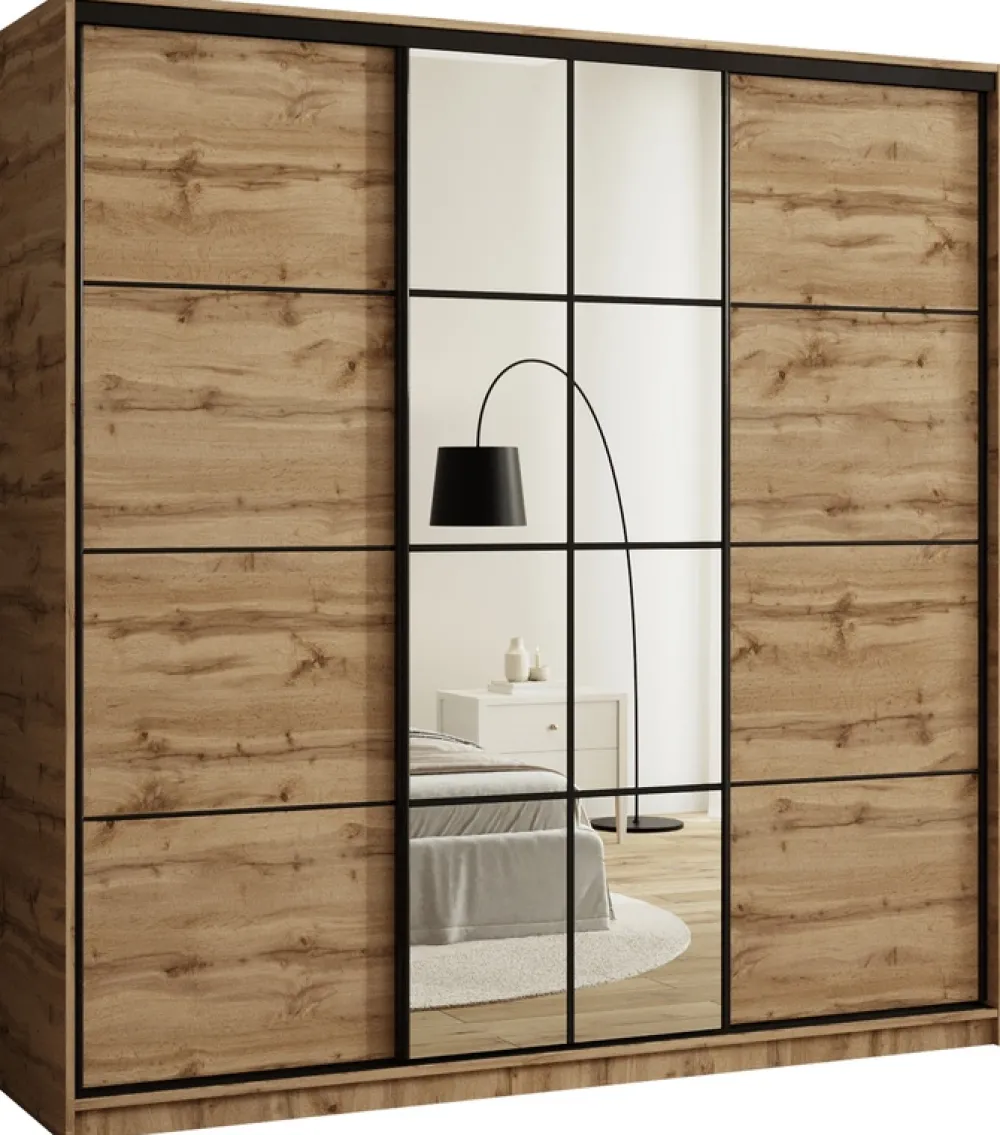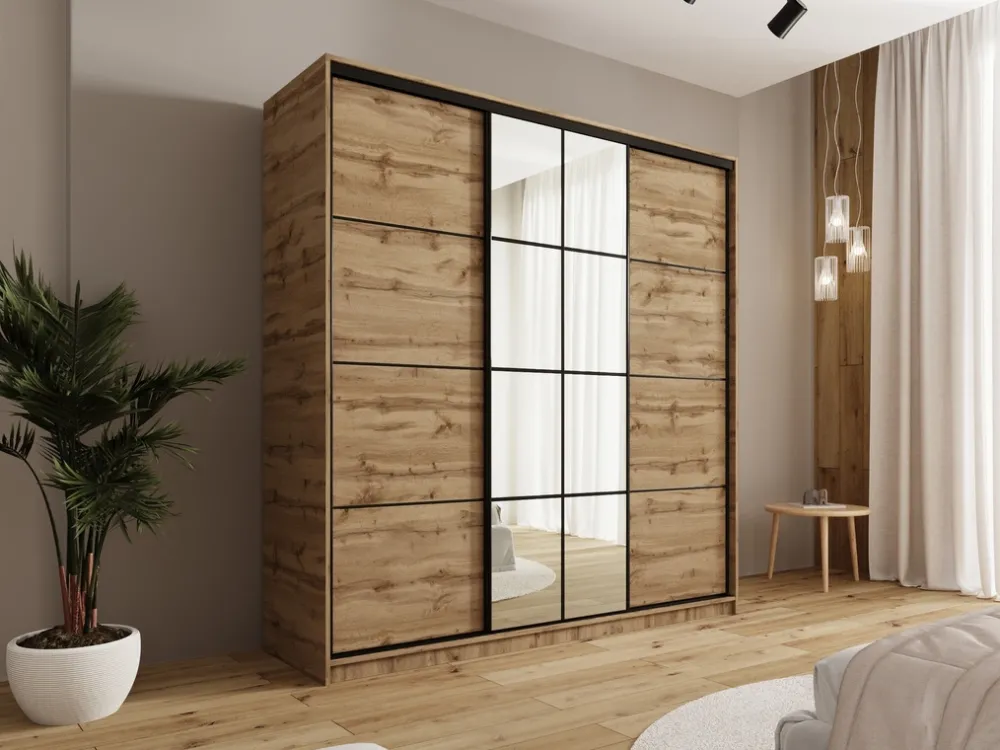 Nasza szafa z lustrem 200 cm wyróżnia się nowoczesnym wyglądem dzięki trzem drzwiom na stalowym systemie przesuwnym w eleganckim, czarnym kolorze. Czarne stalowe uchwyty dodają meblowi wyjątkowego charakteru, a jednocześnie zapewniają solidność i długowieczność użytkowania. System przesuwny umożliwia łatwe otwieranie i zamykanie drzwi bez potrzeby zajmowania dodatkowej przestrzeni.