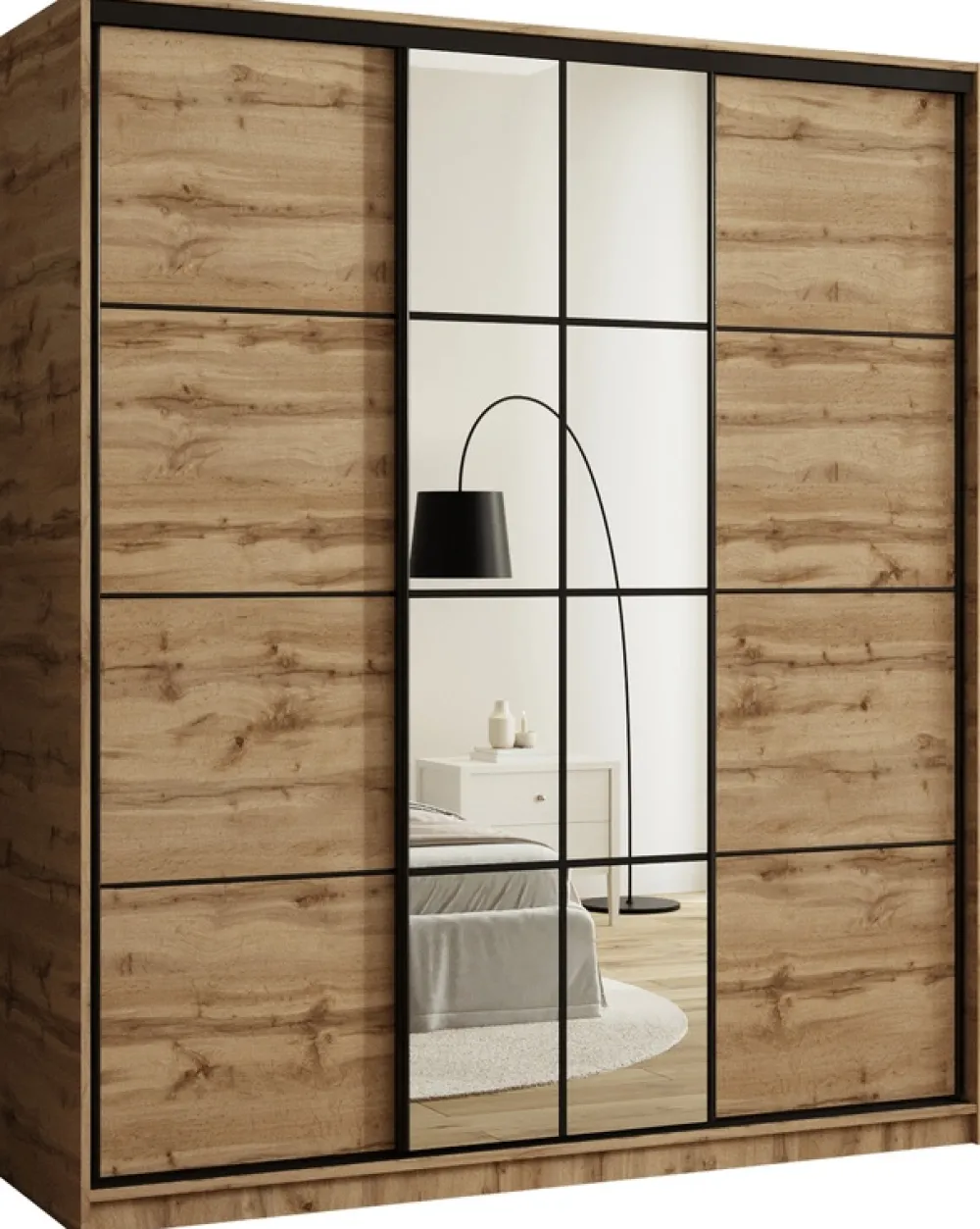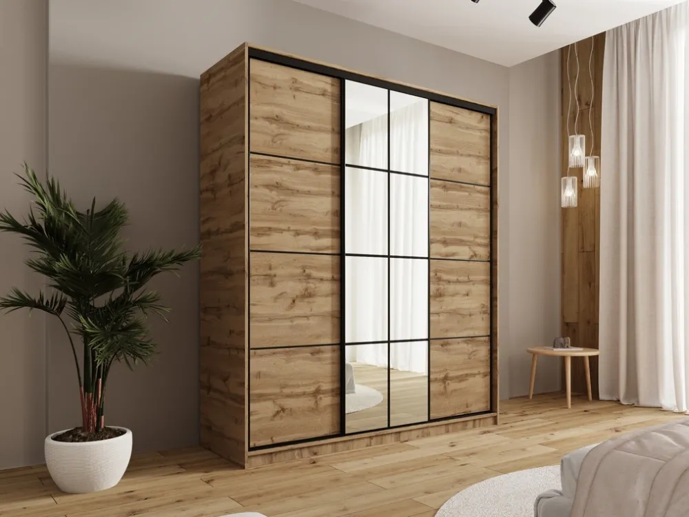 Szafa wyposażona jest w trzy drzwi przesuwne, które poruszają się na czarnym stalowym systemie przesuwnym, gwarantując płynne i ciche działanie. Czarne stalowe uchwyty dodają całości nowoczesnego charakteru, a wysokiej jakości materiały zapewniają trwałość i solidność mebla.