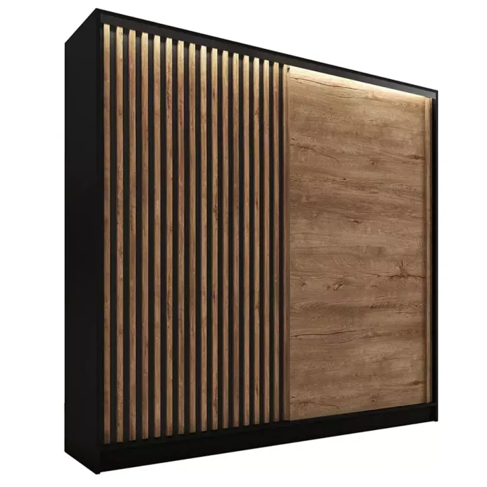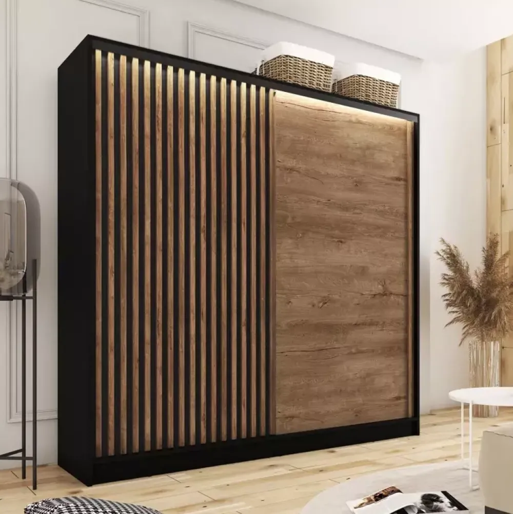 - Szafa niewyposażona w tradycyjne uchwyty, otwieranie odbywa się za pomocą listew przymocowanych do frontu.