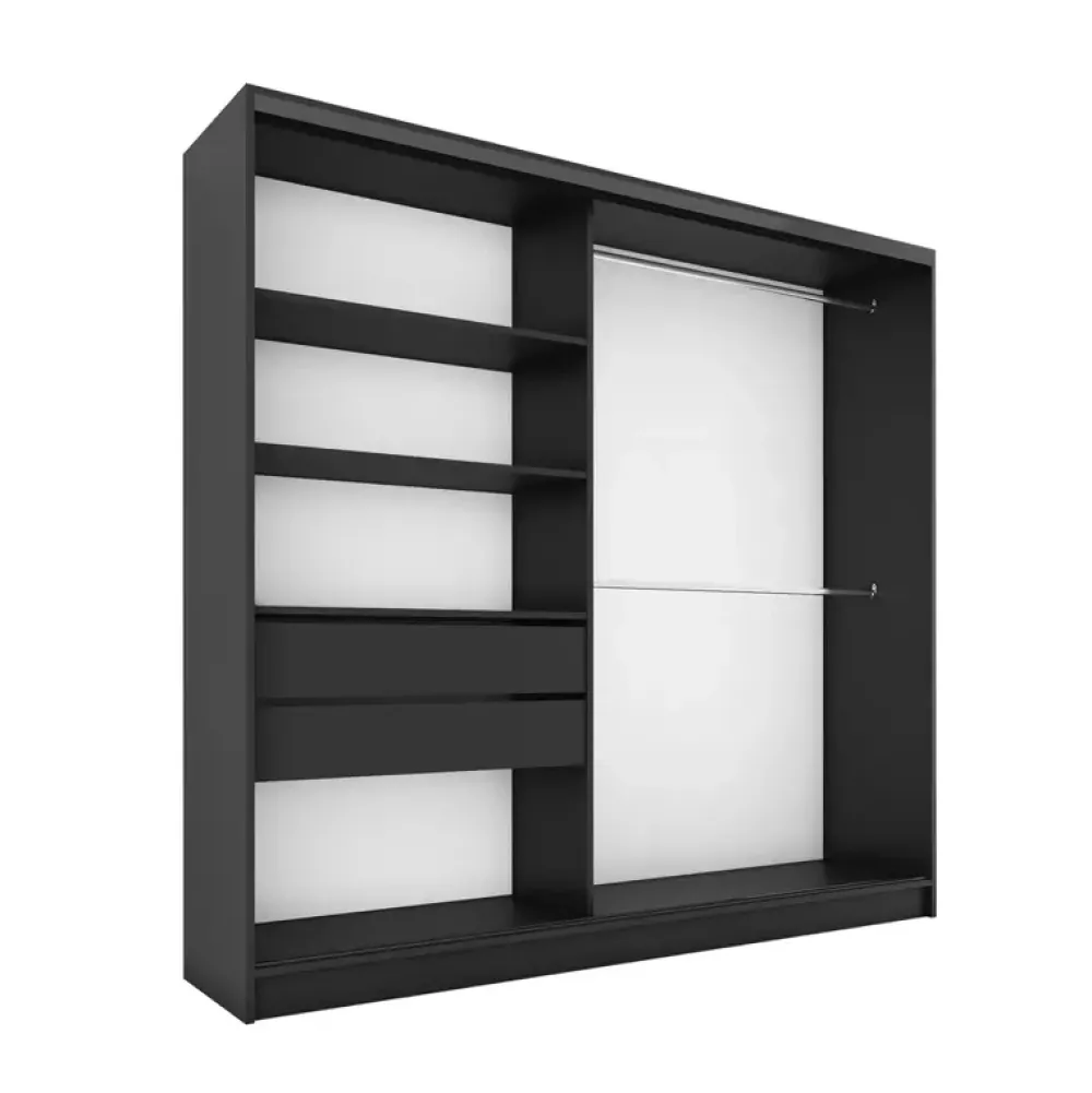 - Szafa przesuwna o szerokości 200 cm z wnętrzem zaaranżowanym z nastawieniem na jak największą swobodę użytkowania. Cztery duże półki, dwie szerokie szuflady oraz dwa drążki do samodzielnego nawiercenia, aby każdy mógł dopasować szafę do swoich potrzeb!