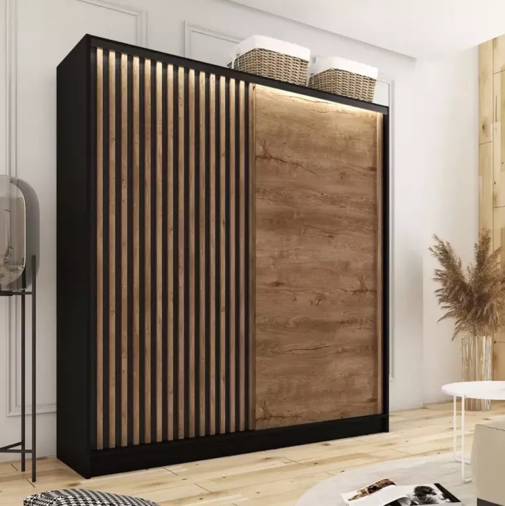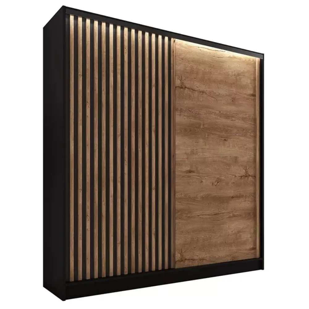 - Szafa niewyposażona w tradycyjne uchwyty, otwieranie odbywa się za pomocą listew przymocowanych do frontu.