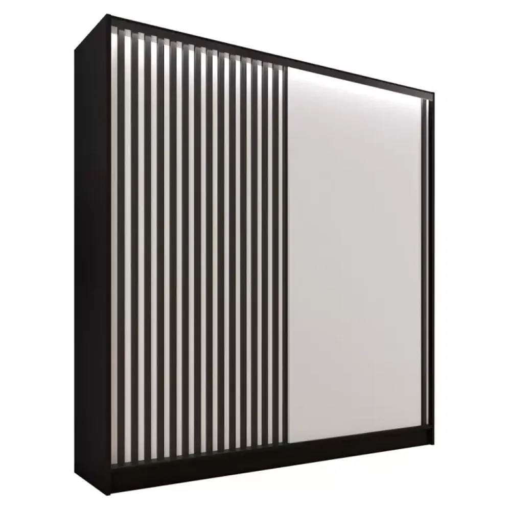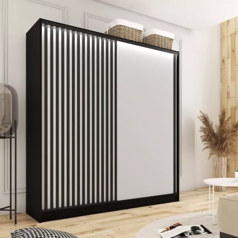- Szafa niewyposażona w tradycyjne uchwyty, otwieranie odbywa się za pomocą listew przymocowanych do frontu.