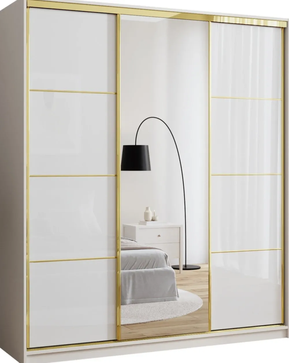 Dodaj swojej sypialni nuty luksusu i porządku dzięki eleganckiej szafie przesuwnej o szerokości 180 cm. Połączenie lustra, złotych detali i praktycznego układu wnętrza sprawia, że to idealne rozwiązanie do przechowywania ubrań, które jednocześnie staje się ozdobą wnętrza. Środkowe drzwi z lustrem optycznie powiększają przestrzeń, a złoty system przesuwny ze szprosami nadaje szafie nowoczesny, a zarazem szykowny charakter.