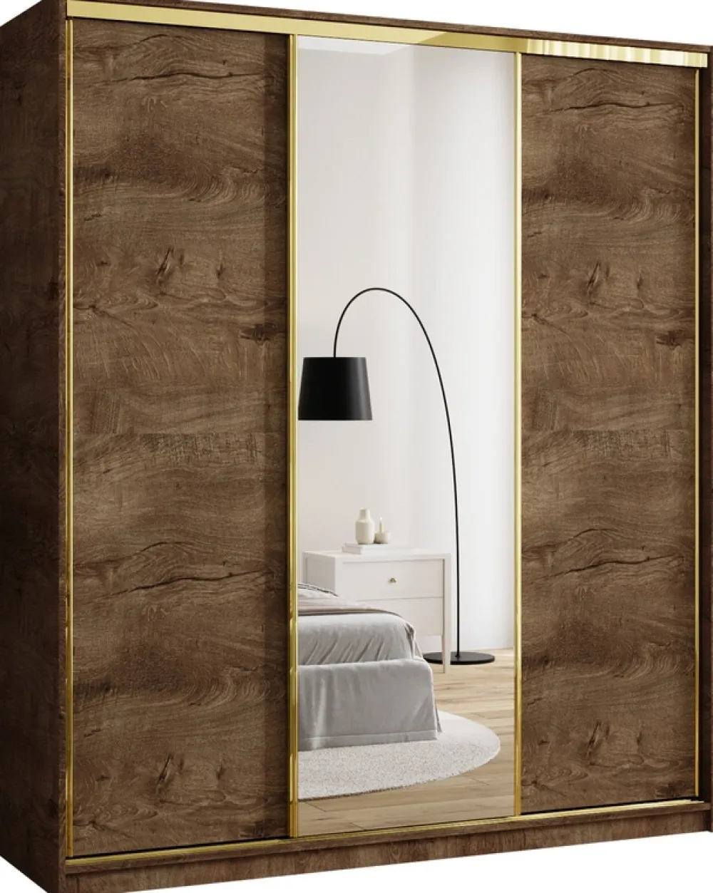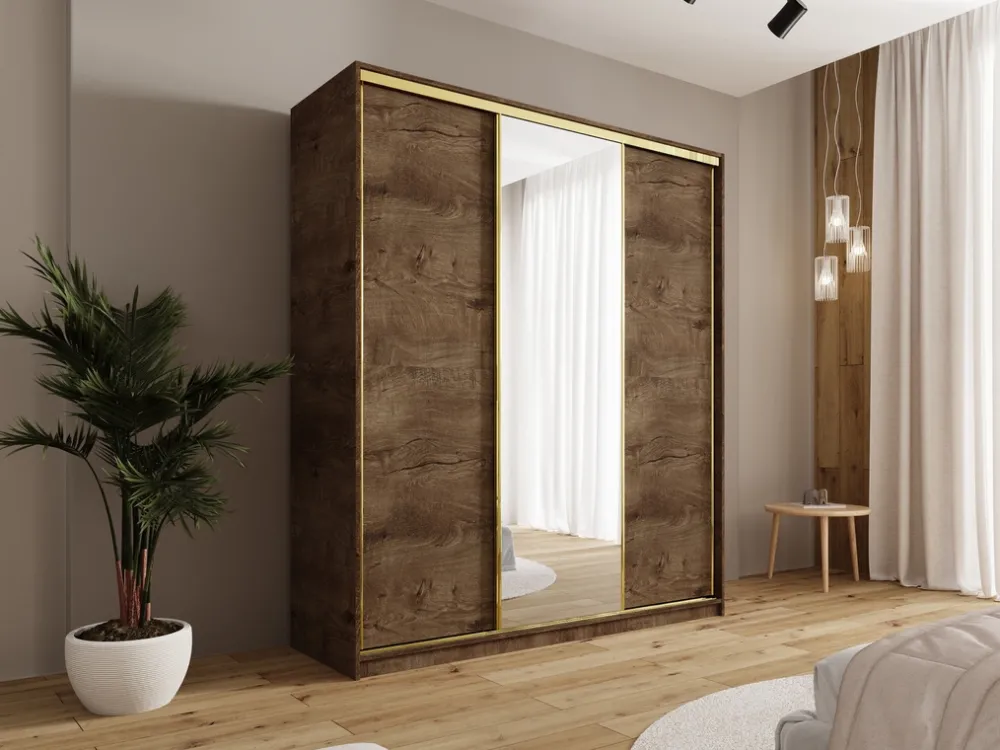 Dodaj swojej sypialni nuty luksusu i porządku dzięki eleganckiej szafie przesuwnej o szerokości 180 cm. Połączenie lustra, złotych detali i praktycznego układu wnętrza sprawia, że to idealne rozwiązanie do przechowywania ubrań, które jednocześnie staje się ozdobą wnętrza. Środkowe drzwi z lustrem optycznie powiększają przestrzeń, a złoty system przesuwny ze szprosami nadaje szafie nowoczesny, a zarazem szykowny charakter.