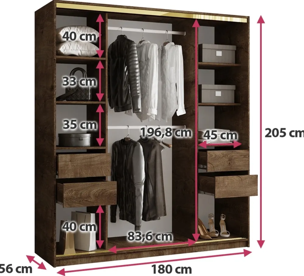 - Szafa przesuwna z lustrem 180 cm GOLD NEW charakteryzuje się pojemnym wnętrzem oraz nowoczesnym designem. Środkowe drzwi szafy zostały wzbogacone o duże lustro, wewnątrz znajduje się osiem półek na ubrania, cztery szuflady, oraz dwa drążki na wieszaki.