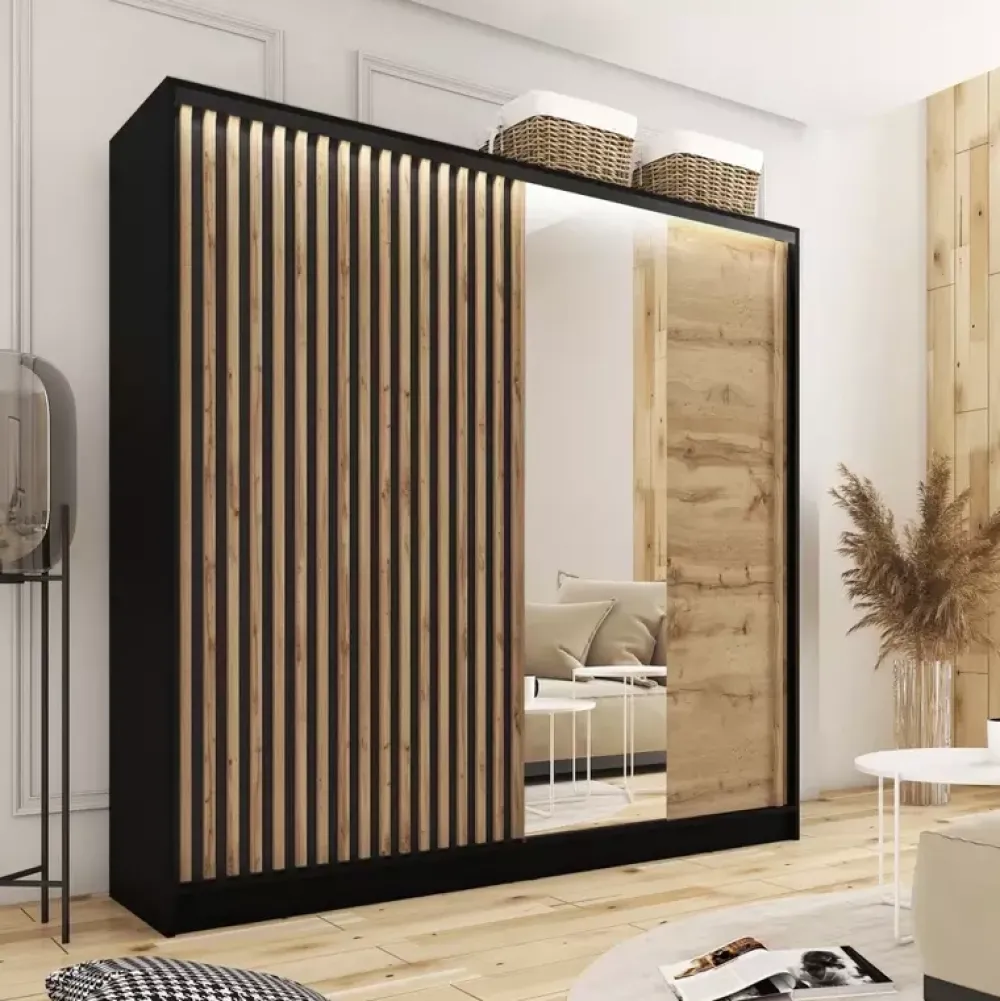 - Szafa niewyposażona w tradycyjne uchwyty, otwieranie odbywa się za pomocą listew przymocowanych do frontu.