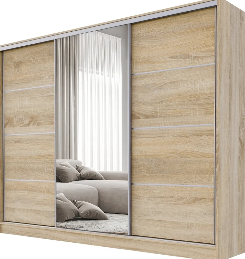 Szafa przesuwna z lustrem posiada duże lustro umieszczone na środkowych drzwiach. Oferuje ono praktyczność i wygodę, pozwalając na oglądanie całej sylwetki. Jednocześnie lustro optycznie powiększa przestrzeń, sprawiając, że pomieszczenie wydaje się jaśniejsze i bardziej przestronne.