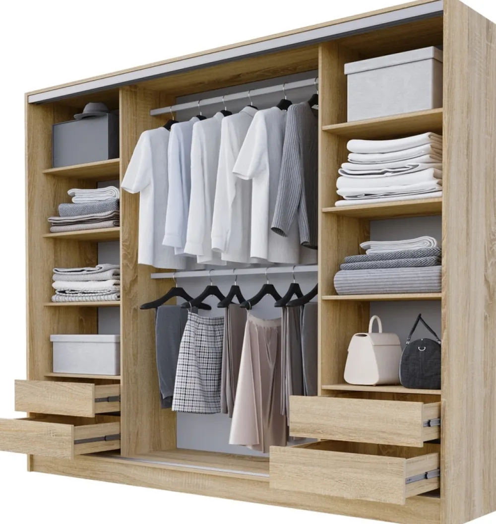 Na dole szafy znajdują się cztery przestronne szuflady, które płynnie poruszają się na prowadnicach kulkowych. Szuflady te są idealne do przechowywania drobniejszych przedmiotów, takich jak bielizna, skarpetki czy akcesoria.