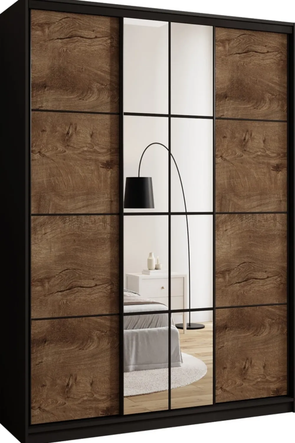 Poznaj wyjątkową szafę przesuwną z lustrem EDGE, która łączy w sobie nowoczesny design, praktyczne rozwiązania i wysoką jakość wykonania. Ten elegancki mebel to doskonałe uzupełnienie każdej sypialni, garderoby lub przedpokoju. Drzwi przesuwne poruszają się na wytrzymałym stalowym systemie w czarnym kolorze, który zapewnia płynność i trwałość użytkowania. Całość dopełniają czarne stalowe uchwyty, podkreślające nowoczesny charakter mebla.