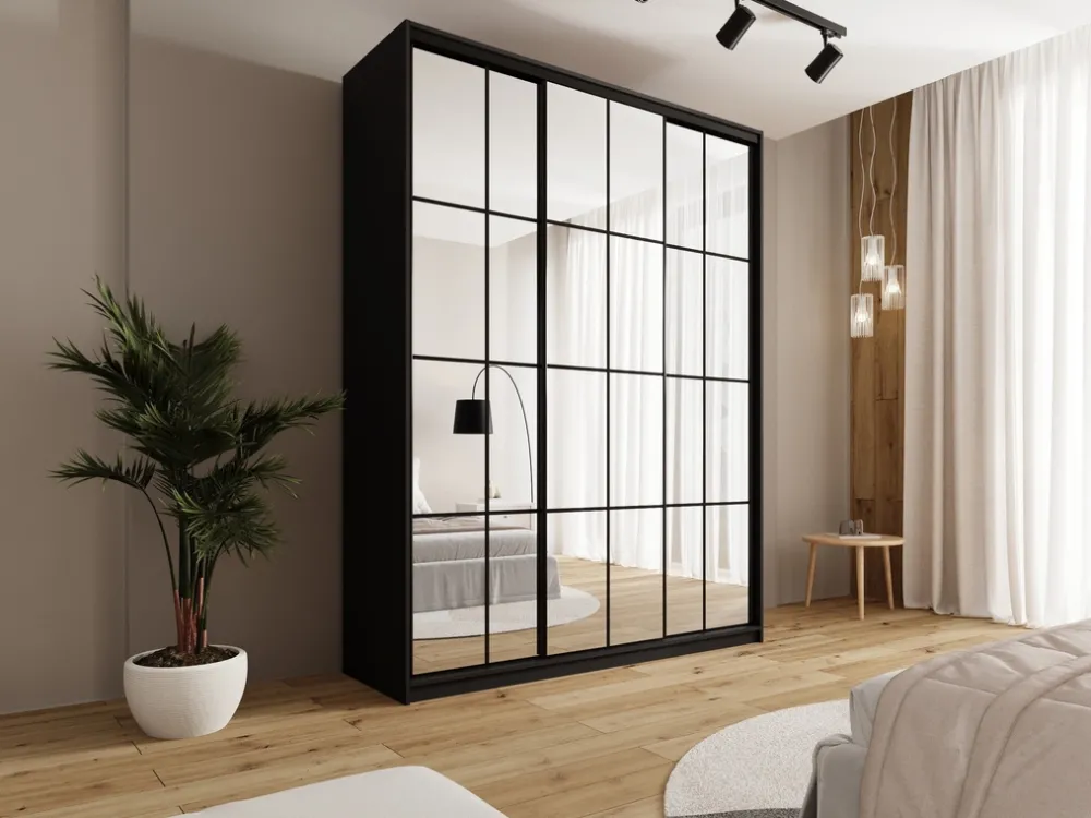 - Lustro szafy posiada dekoracyjne szprosy w czarnym kolorze o grubości 16 mm. Lustro po rozpakowaniu posiada już zamontowane szprosy.