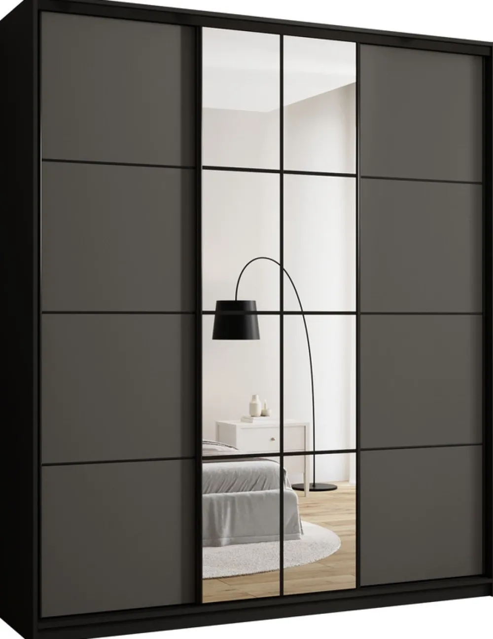 - Lustro szafy posiada dekoracyjne szprosy w czarnym kolorze o grubości 16 mm. Lustro po rozpakowaniu posiada już zamontowane szprosy.