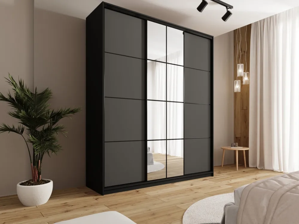Szafa przesuwna o szerokości 200 cm EDGE MAX to idealny wybór dla osób, które poszukują stylowego i pojemnego mebla do swojego wnętrza. Dzięki stalowemu systemowi przesuwnemu w czarnym kolorze, drzwi poruszają się lekko i bezgłośnie, a nowoczesny design podkreśla elegancję pomieszczenia.