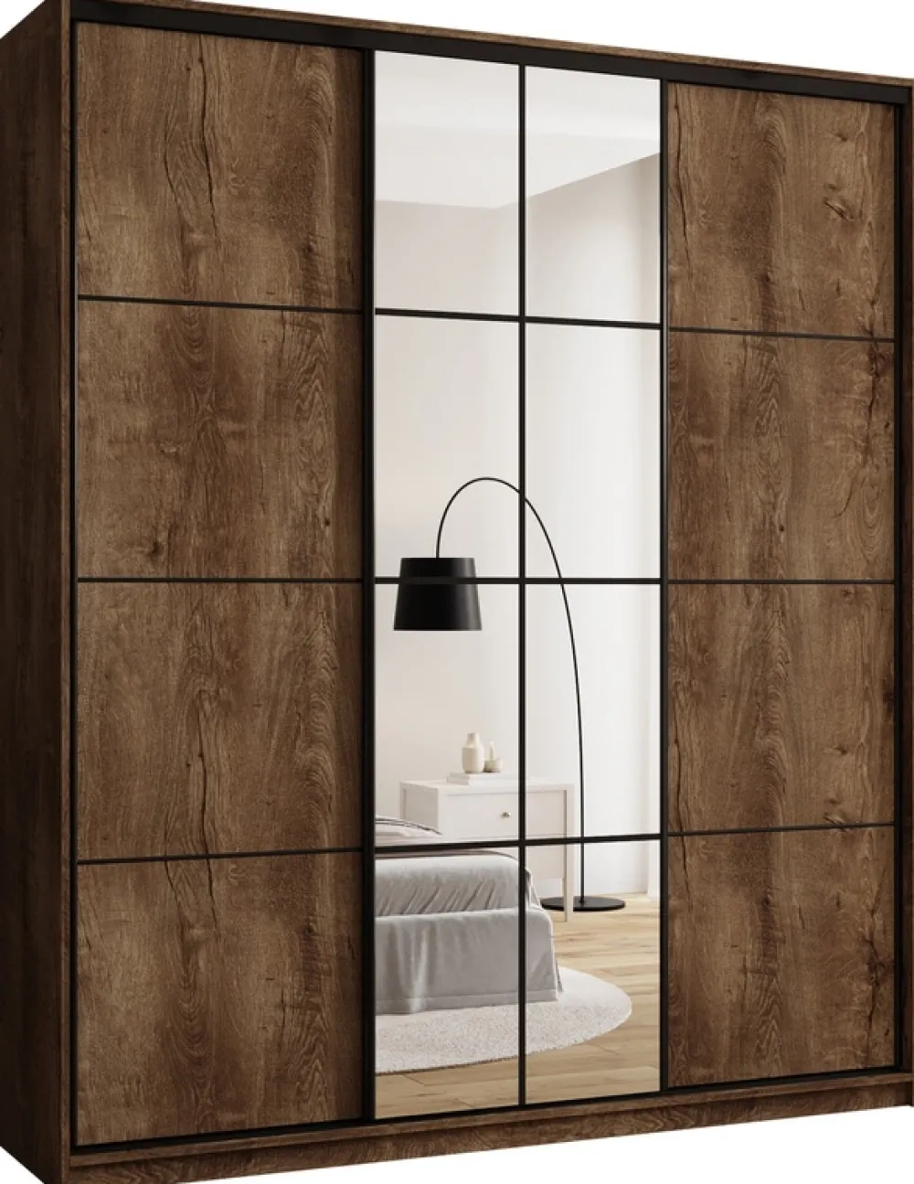 Na środku szafy znajduje się duże lustro, które optycznie powiększa przestrzeń i odbija światło, nadając wnętrzu lekkości. To praktyczny element, który pozwoli Ci wygodnie sprawdzić swoją stylizację i rozjaśni każde pomieszczenie.