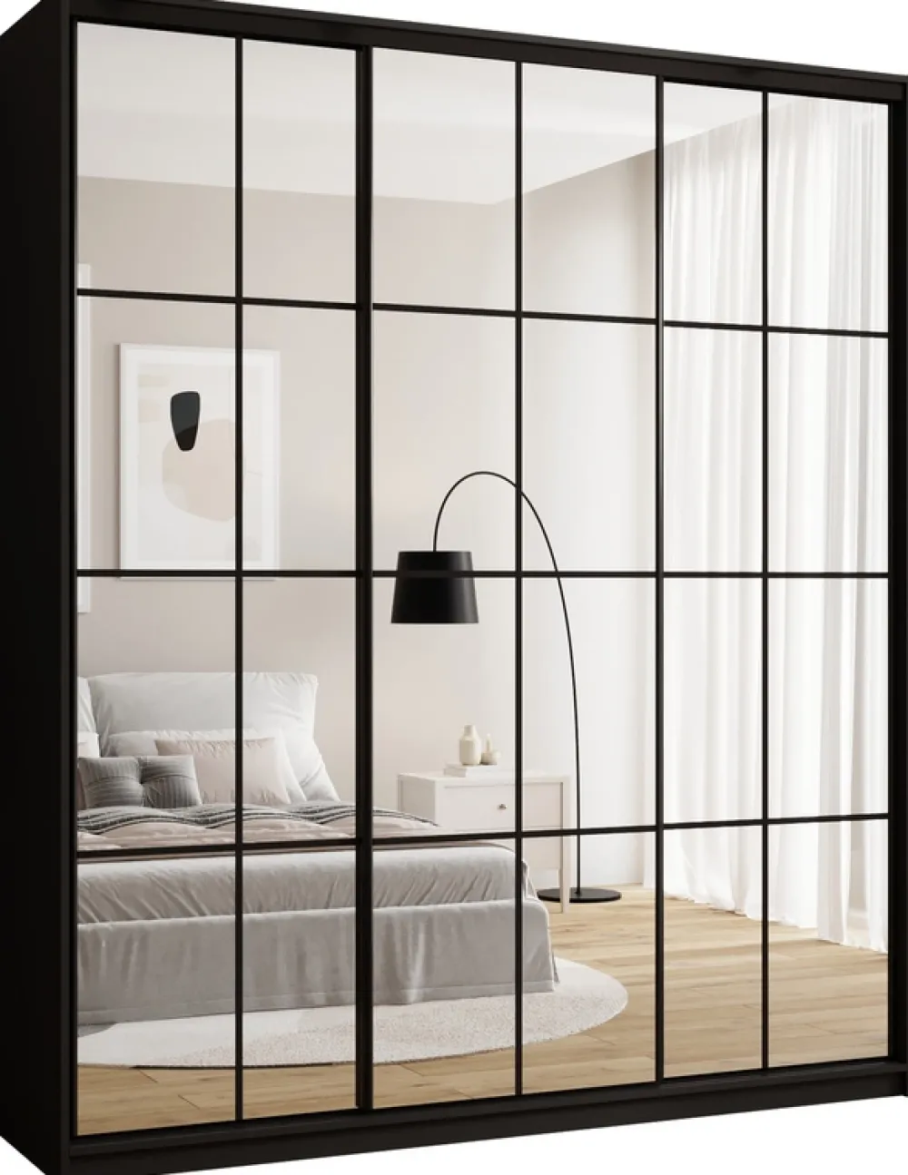 - Lustro szafy posiada dekoracyjne szprosy w czarnym kolorze o grubości 16 mm. Lustro po rozpakowaniu posiada już zamontowane szprosy.