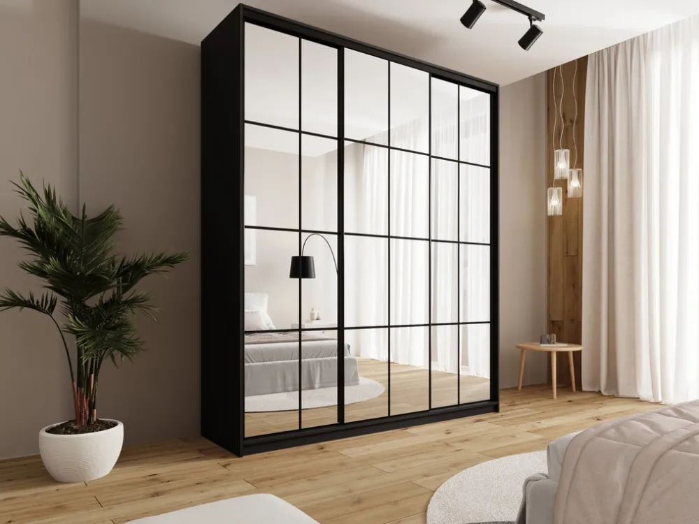 Szafa przesuwna o szerokości 200 cm OPTICA MAX to mebel, który łączy nowoczesny design z wyjątkową praktycznością. Stalowy system przesuwny w czarnym kolorze zapewnia płynne i ciche otwieranie drzwi, podkreślając elegancję i minimalistyczny charakter szafy. Jej trzy drzwi w całości pokryte lustrem nie tylko dodają wnętrzu klasy, ale także optycznie powiększają przestrzeń, wprowadzając do pomieszczenia więcej światła.