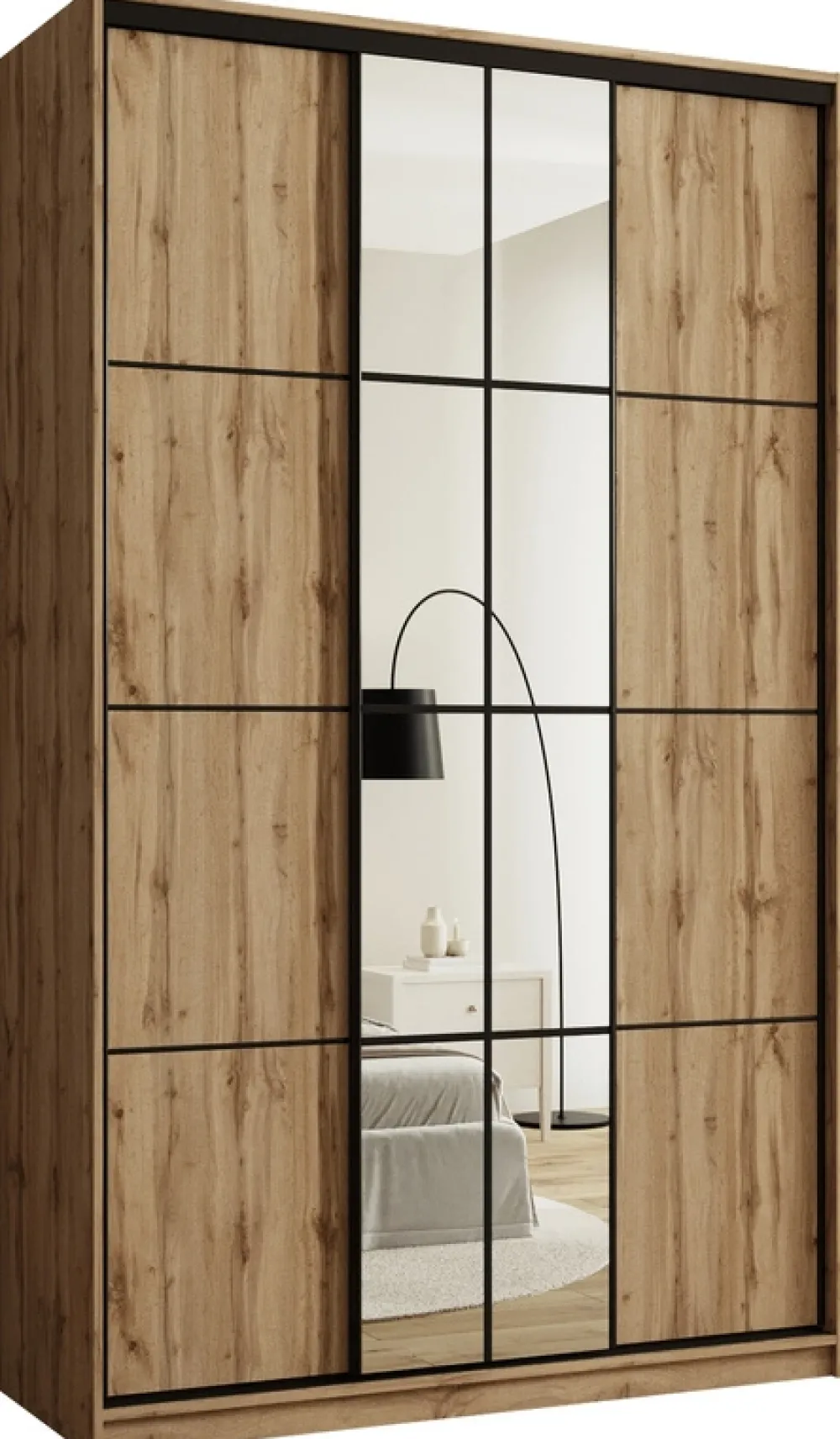 Centralne drzwi szafy zostały ozdobione lustrem, które nie tylko ułatwia codzienne przygotowania, ale również optycznie powiększa przestrzeń, wnosząc do pomieszczenia więcej światła. Dzięki temu szafa świetnie sprawdzi się zarówno w sypialni, jak i przedpokoju.