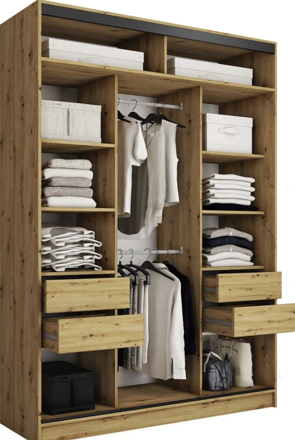 Wnętrze szafy zostało zaprojektowane z myślą o maksymalnej wygodzie. Po lewej i prawej stronie znajdziesz po pięć pojemnych półek oraz dwie praktyczne szuflady, które pomieszczą ubrania, akcesoria czy tekstylia. Środkowa część wyposażona jest w aluminiowe drążki na wieszaki, idealne na marynarki, sukienki czy płaszcze.