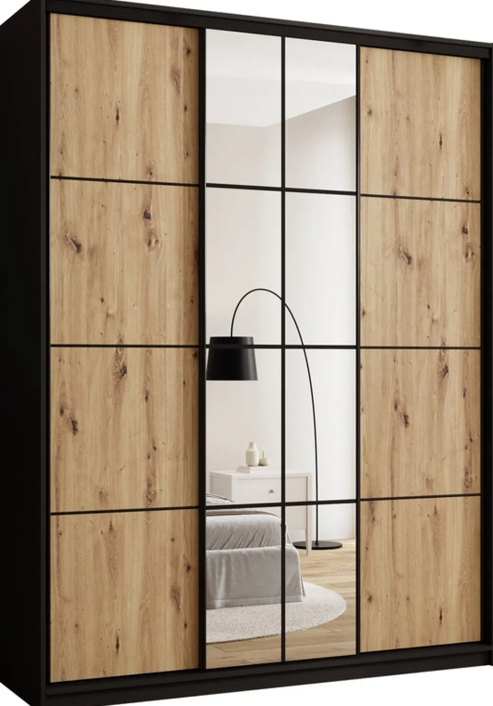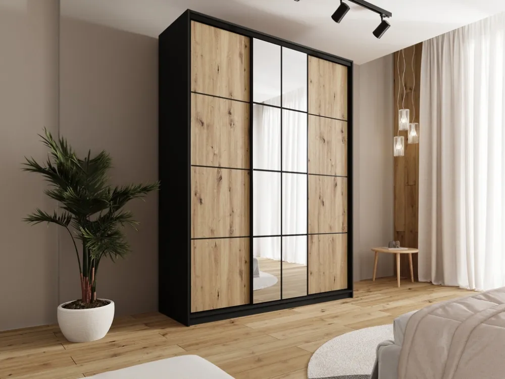 Centralną część szafy zdobi lustro, które nie tylko dodaje stylu, ale także optycznie powiększa przestrzeń, wprowadzając więcej światła do pomieszczenia. To praktyczny dodatek, który sprawdzi się zarówno w sypialni, jak i w przedpokoju.