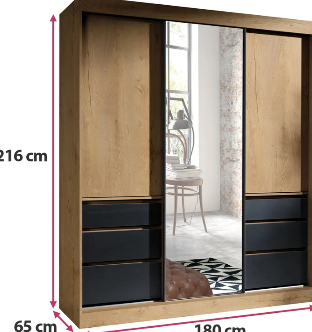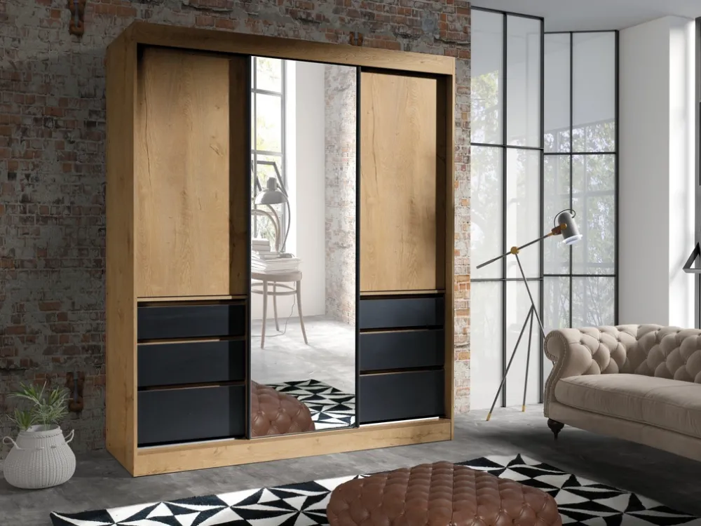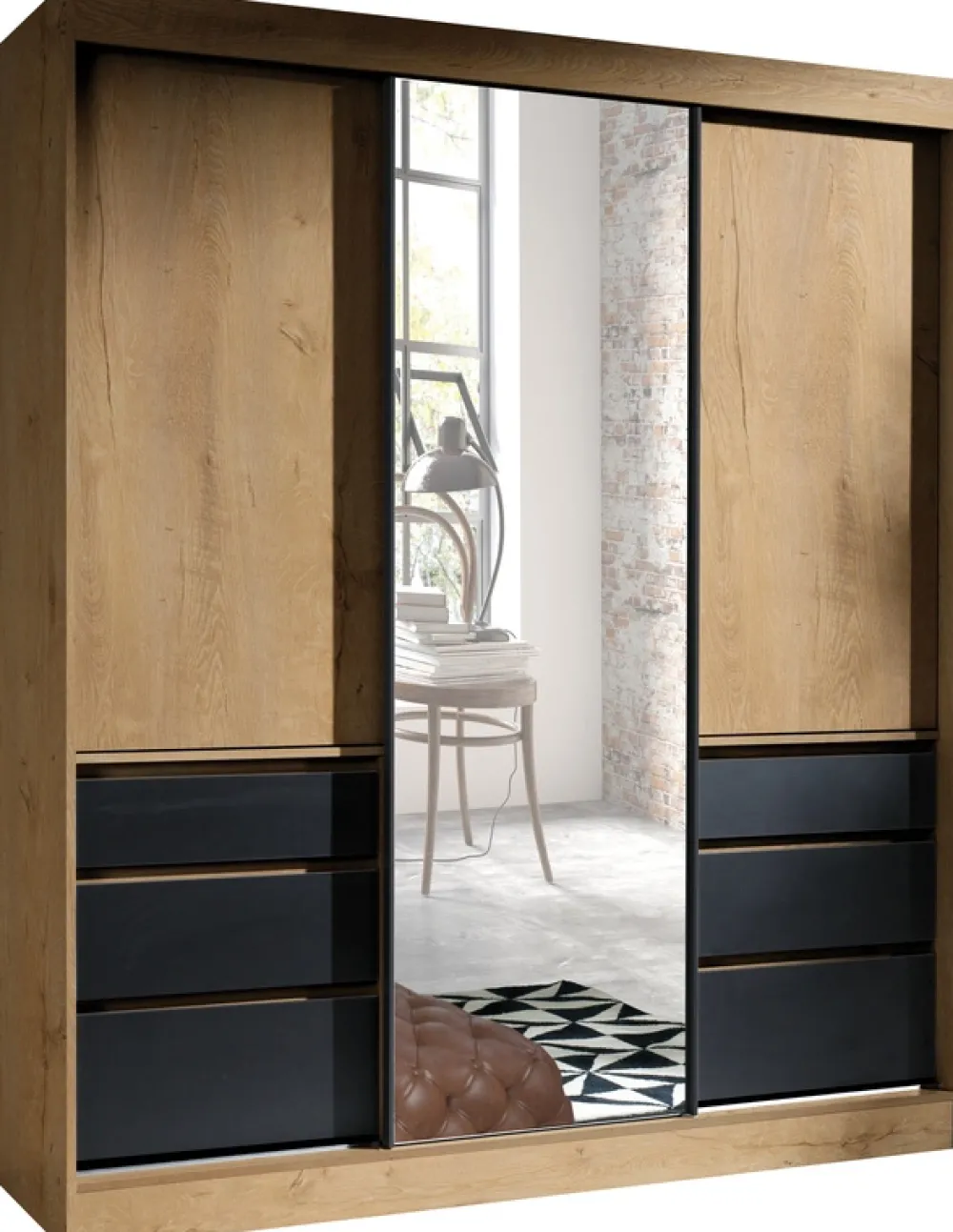 Trzydrzwiowa szafa przesuwna to must-have w każdym nowoczesnym domu. Łączy w sobie elegancję, funkcjonalność i wyjątkowy design. Dzięki lustrowi, pojemnym półkom, drążkom na wieszaki oraz praktycznym szufladom, jest idealnym rozwiązaniem do przechowywania odzieży i dodatków. Sprawdź naszą ofertę i przekonaj się, jak ta szafa może odmienić Twoje wnętrze.