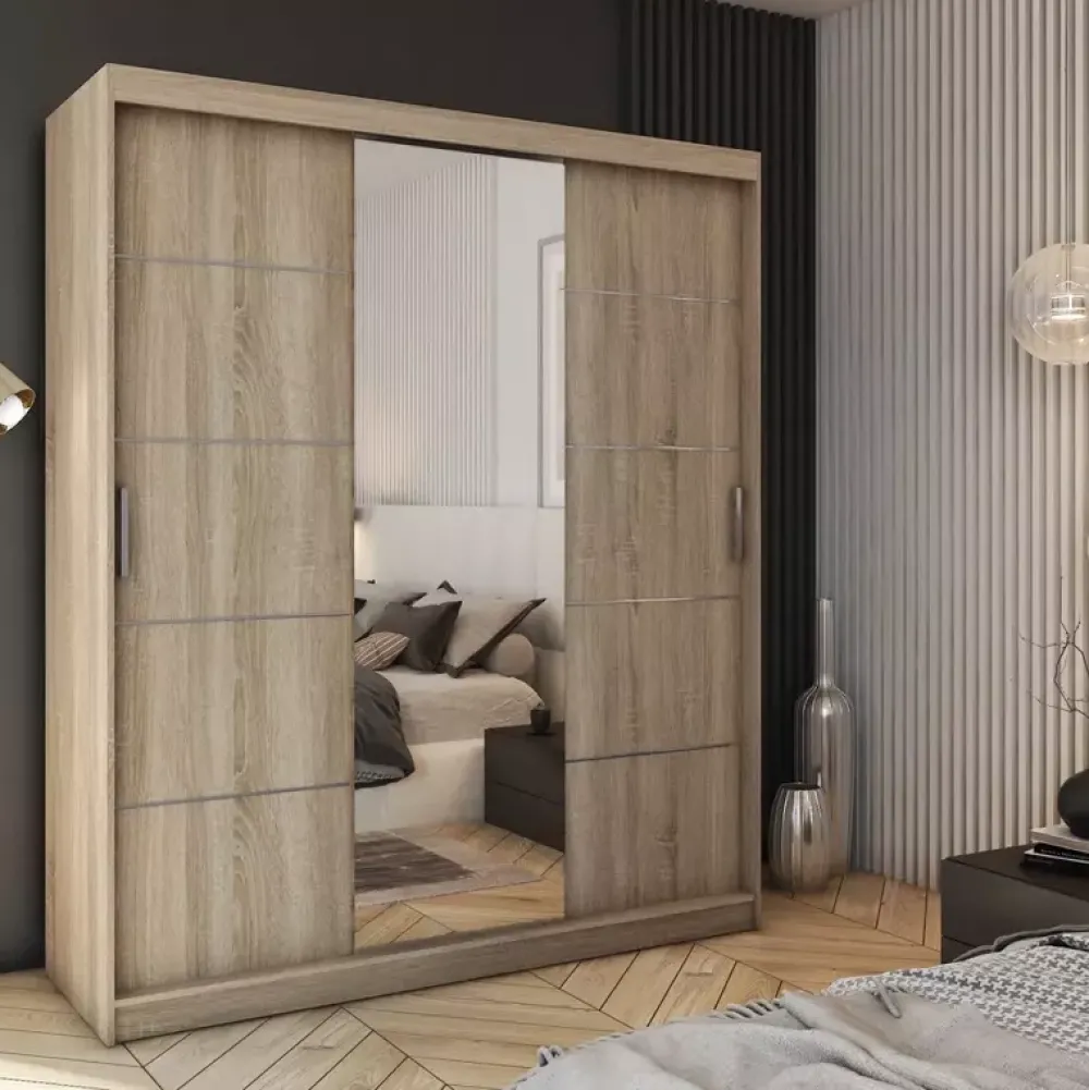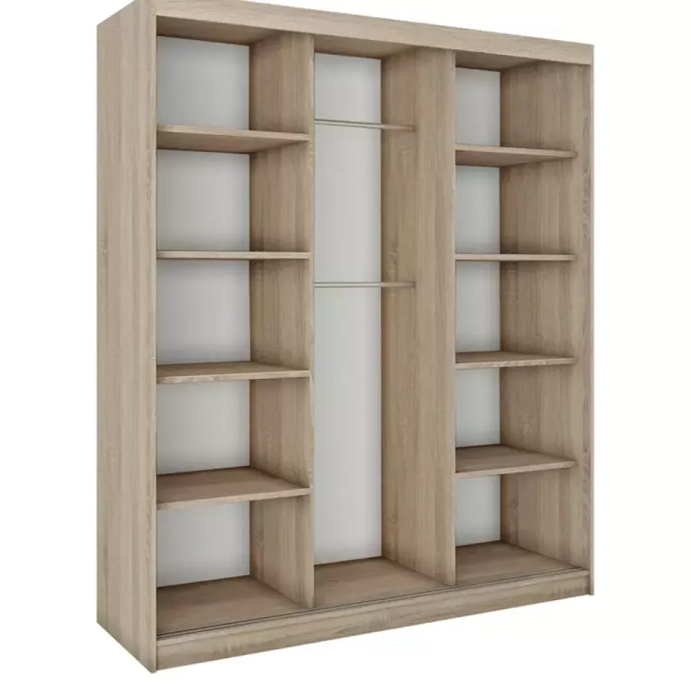 Szafy przesuwne CUBE wykonywane są z najlepszej jakości materiałów, z myślą o wygodnym ich użytkowaniu. Rozmieszczenie półek i drążków pozwoli Ci zapanować nad ładem i porządkiem w garderobie i ułatwi odpowiednią segregację ubrań. Duże szafy na ubrania z serii CUBE wyposażone zostały w osiem półek, na których ułożysz bluzy, swetry, czy koszulki oraz dwa drążki na wieszaki, na których zawiesisz sukienki, koszule, czy płaszcze. Szafy dostępne są w dwóch atrakcyjnych wersjach kolorystycznych, więc możesz dobrać odpowiednią dla swojego wnętrza. Pojemne szafy z lustrem sprawdzą się w sypialni, przedpokoju, salonie, czy pokoju młodzieżowym.