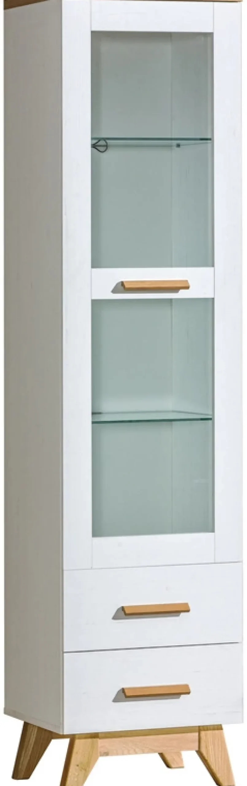 Zestaw wyróżnia się nie tylko wyjątkowym designem, ale również funkcjonalnością i dbałością o detale. Szkło w witrynach nie tylko estetycznie prezentuje zawartość, ale również optycznie powiększa przestrzeń. Dodatkowo, połączenie dwóch naturalnych odcieni drewna z subtelnymi, drewnianymi uchwytami i nóżkami, dodaje zestawowi lekkości i nowoczesnego charakteru, jednocześnie zachowując jego ponadczasowy urok.