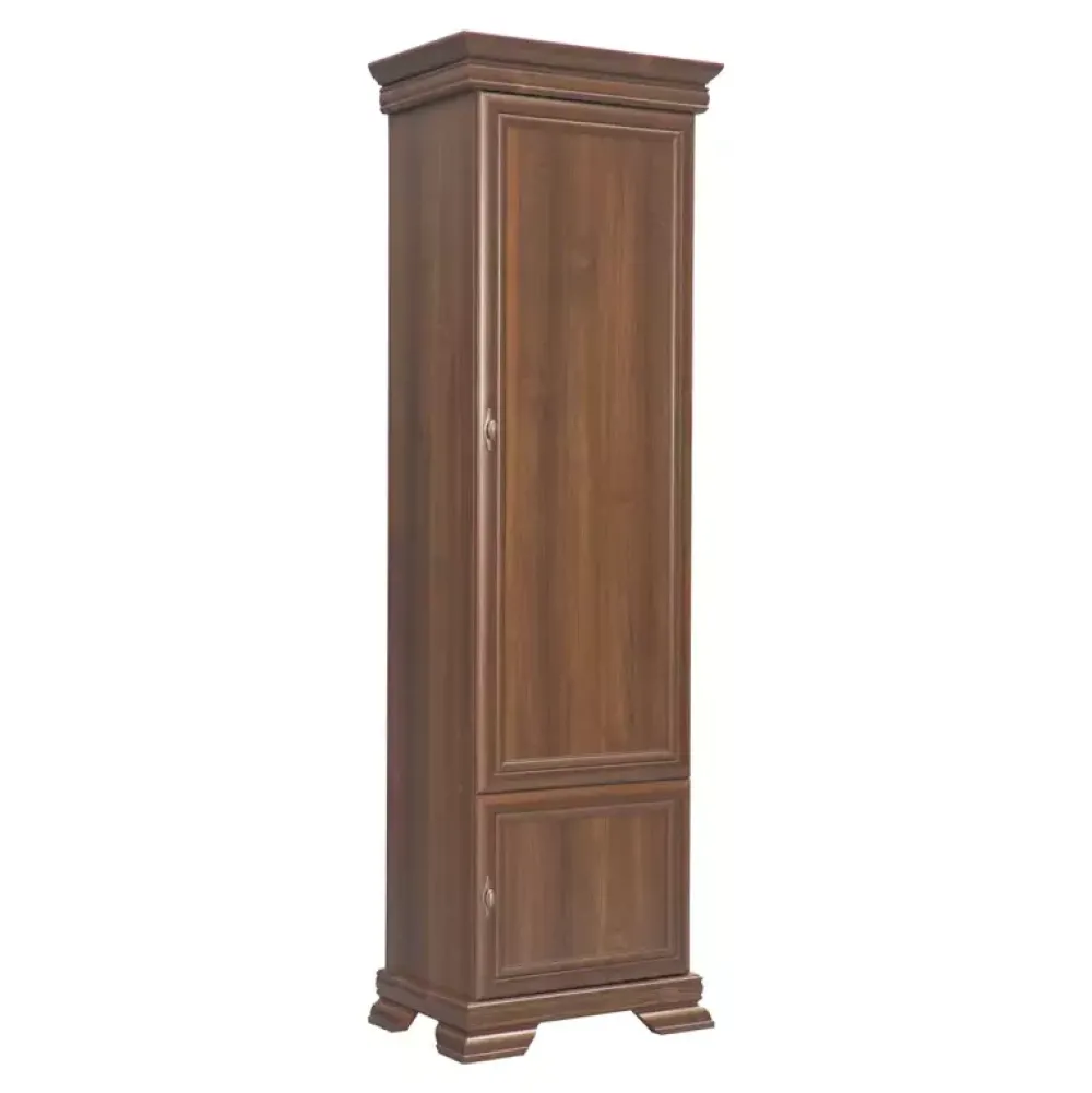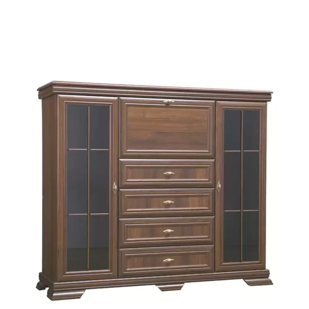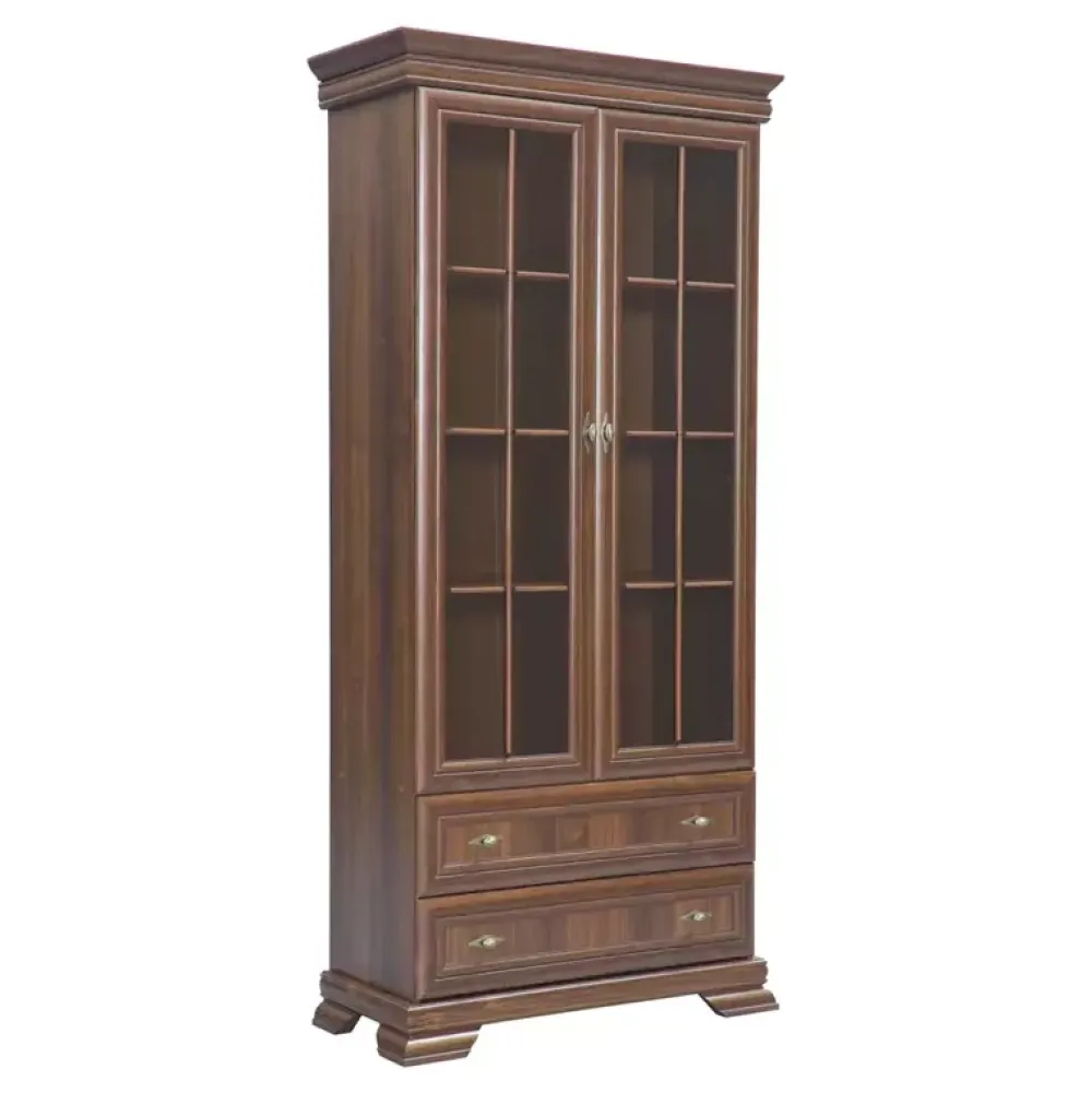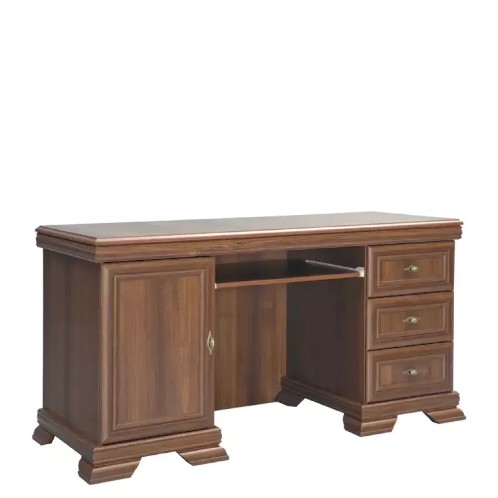 Zestaw mebli KOLONIA to propozycja, która pozwala na kompleksowe umeblowanie biura w eleganckim oraz ponadczasowym stylu. W zestawie swoje miejsce znalazła witryna z trzema półkami znajdującymi się za przeszklonymi drzwiami oraz dwiema szufladami u dołu. Dodatkowym miejscem na książki oraz inne dokumenty może być komoda z parą drzwi w formie witryny, czterema szufladami oraz szafką typu barek nad nimi. Natomiast szafa posiada u dołu zamykaną szafkę, a nad nimi drzwi kryjące za sobą trzy półki. Nie zabrakło również biurka z trzema szufladami po prawej stronie oraz szafką z półką po stronie lewej.