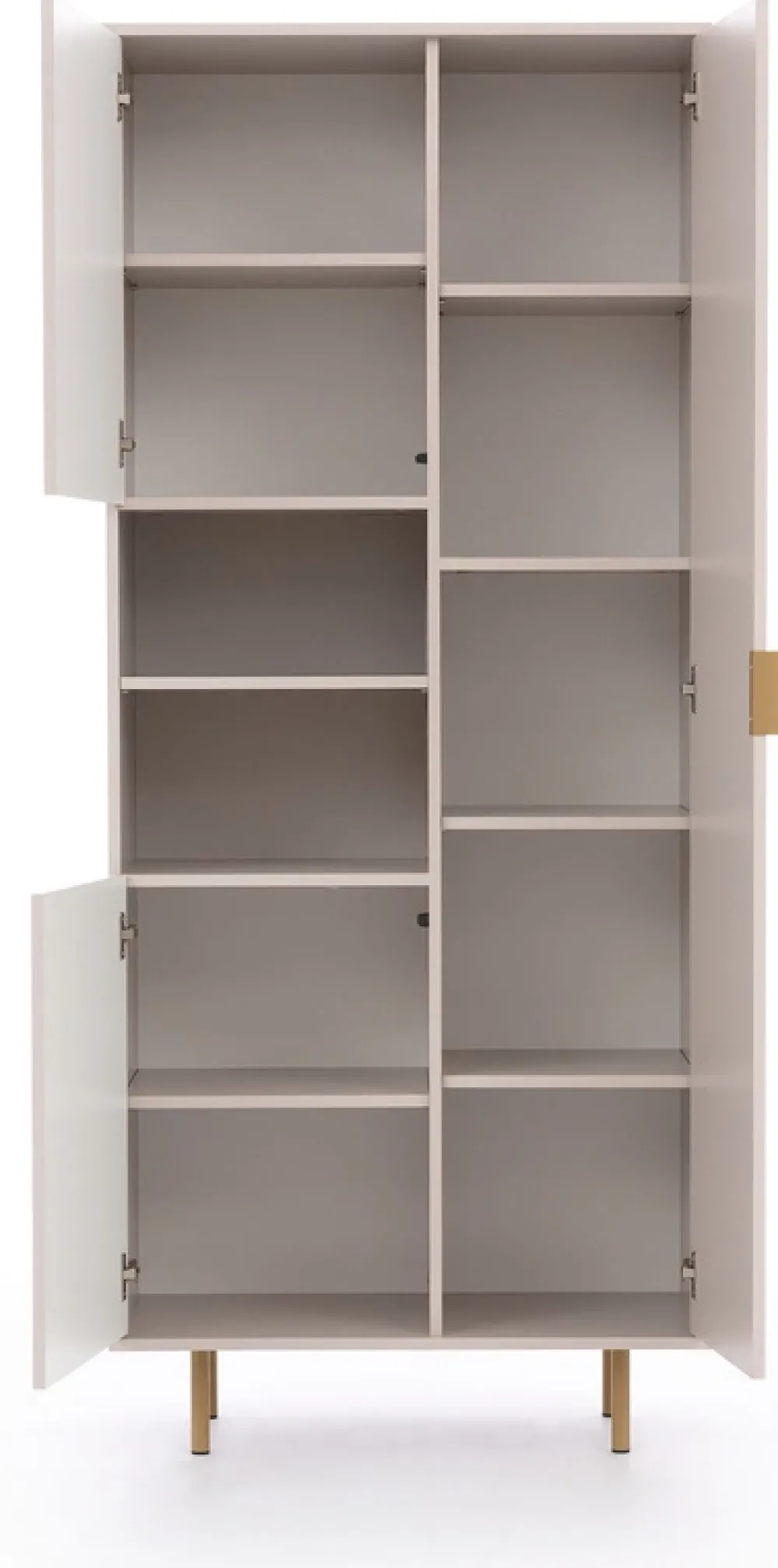 - Regał na książki o szerokości 80 cm NAMASTE. Wykonany został z płyty laminowanej o grubości 16 mm. Regał z półkami posiada troje drzwi w tym dwoje otwierane za pomocą mechanizmu push to open. Nóżki oraz uchwyty metalowe w kolorze złoty beż.