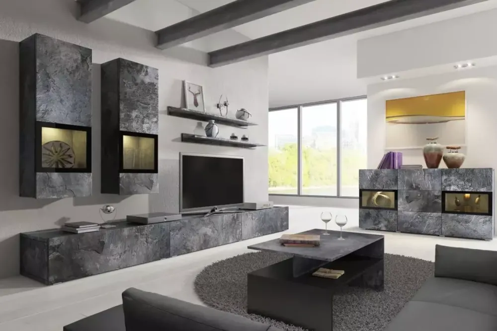 - korpusy oraz fronty mebli to płyta wiórowa laminowana grubości 16 mm o wykończeniu matowym imitującym beton architektoniczny,